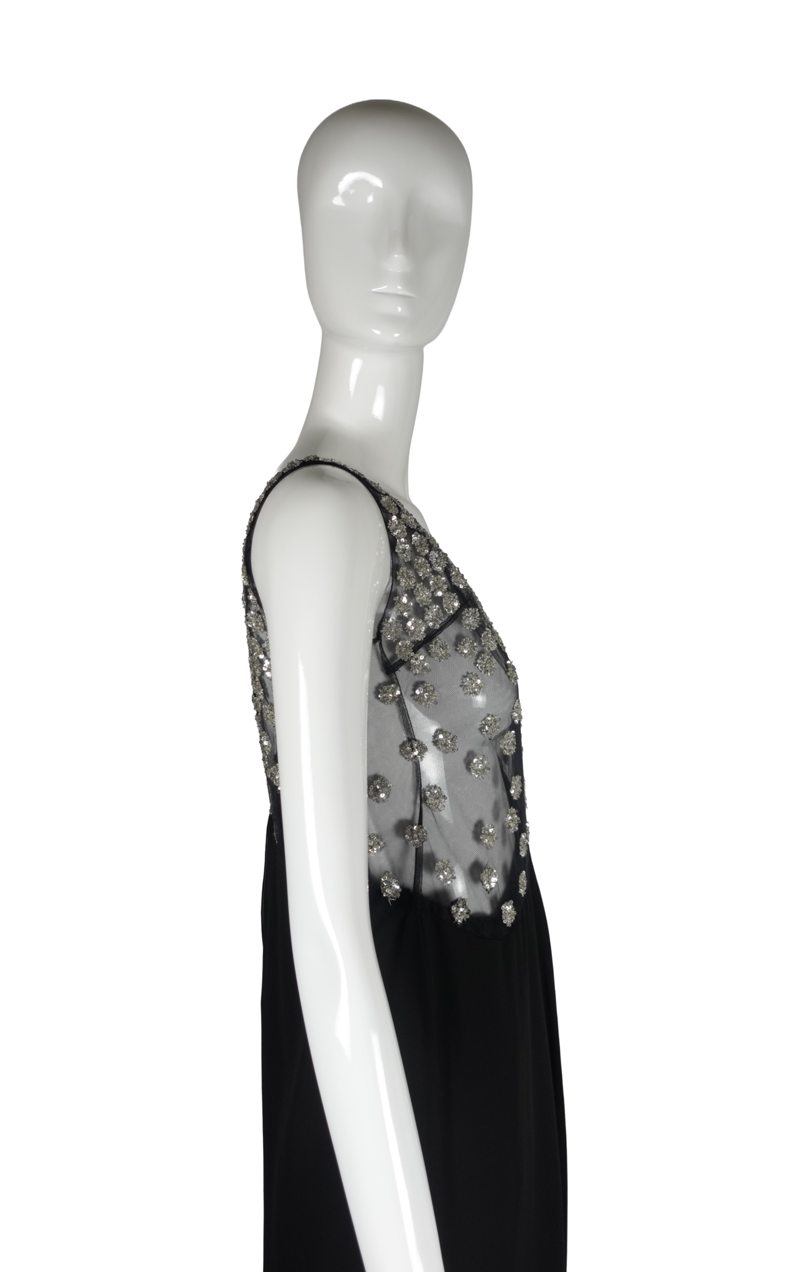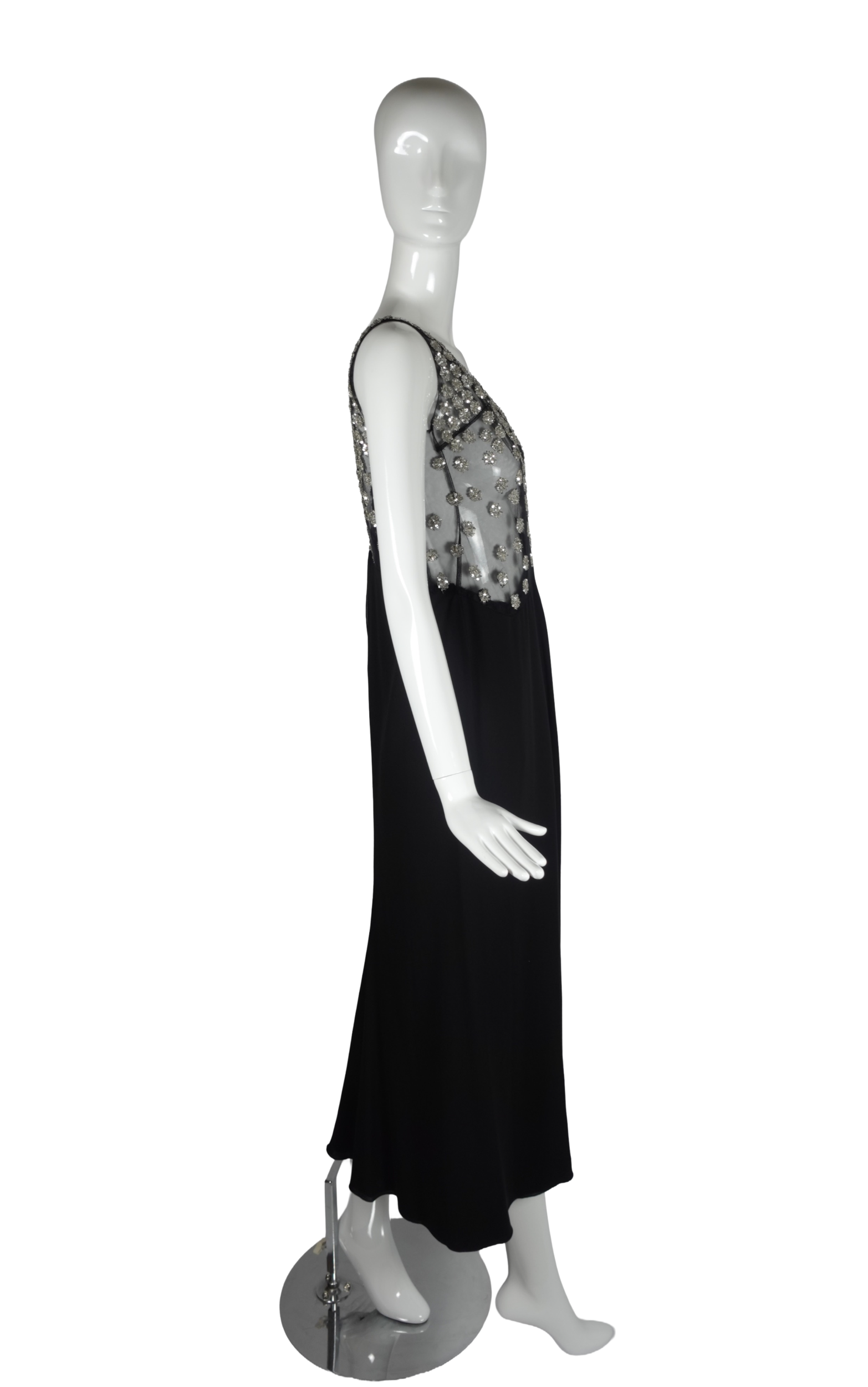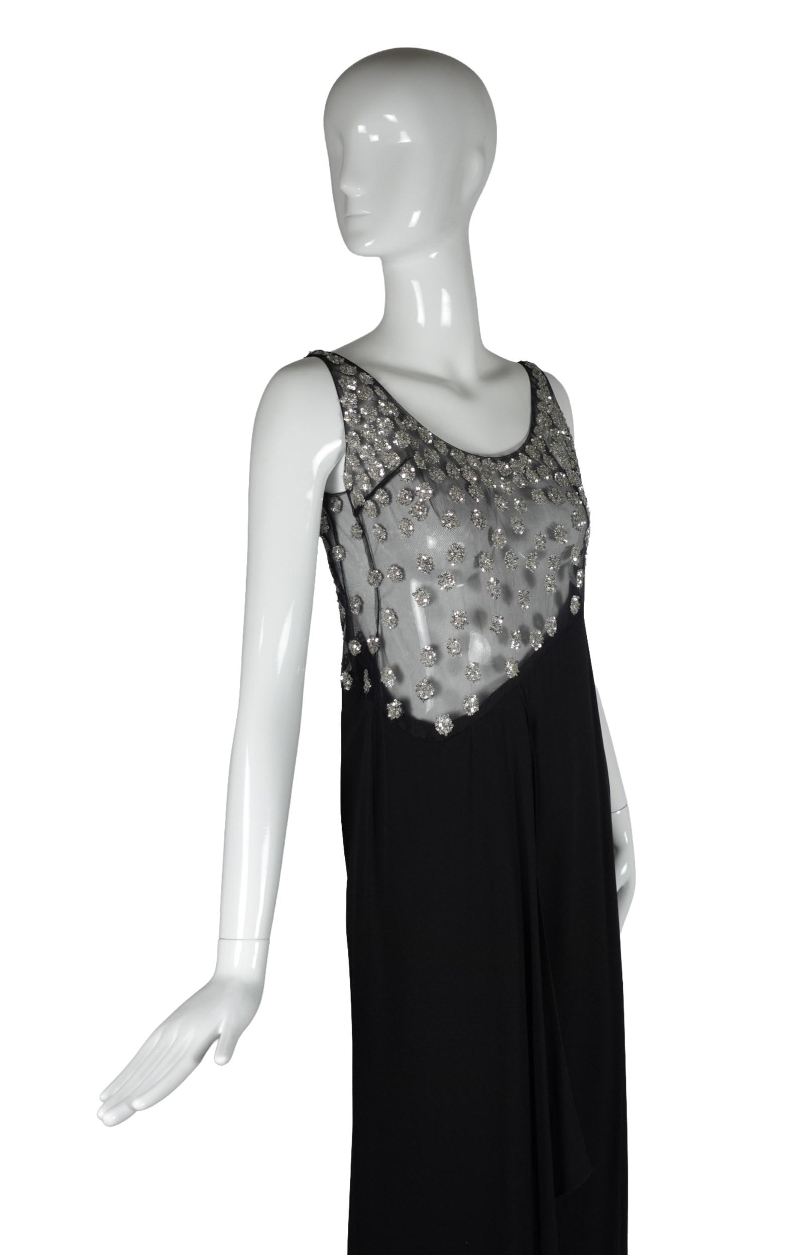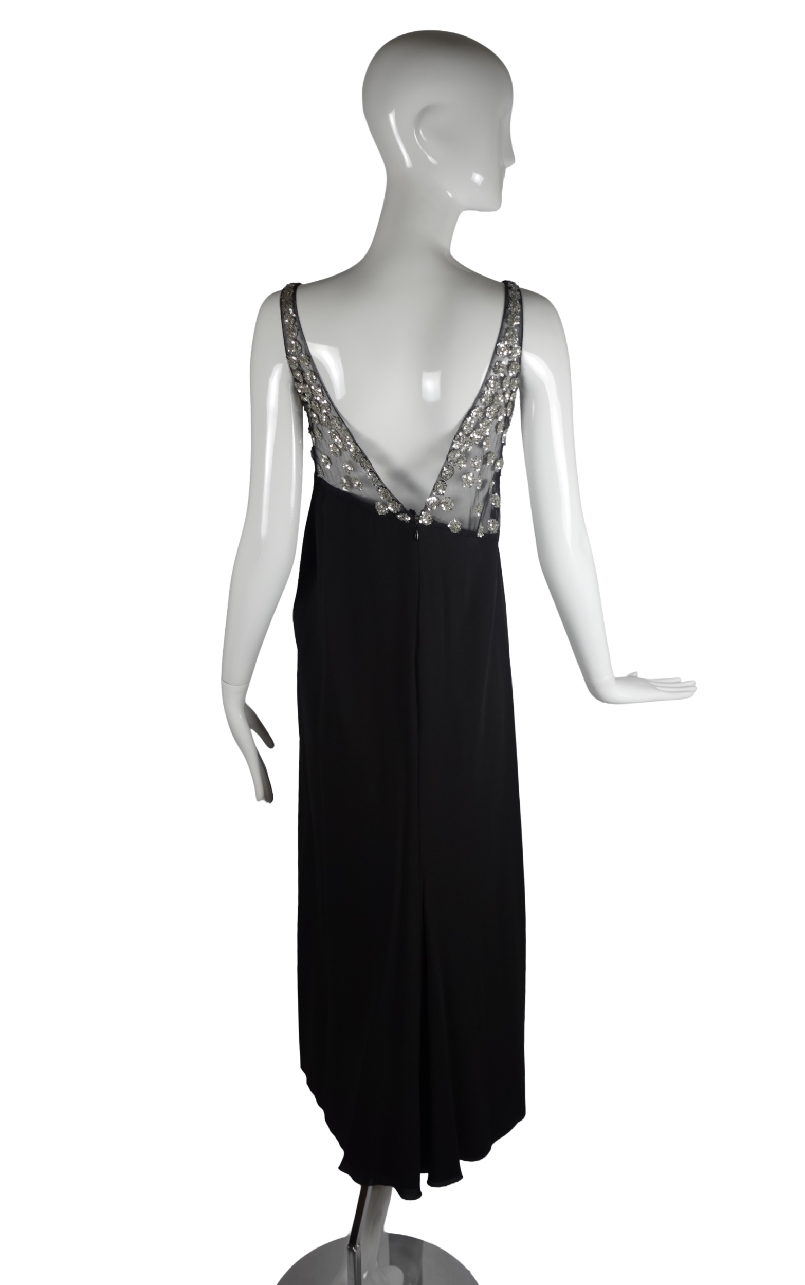 A striking example of Valentino’s mastery of evening wear, this sleeveless maxi gown dates to the late 1990s–early 2000s and exemplifies the house’s signature blend of glamour and refinement. The bodice features a sheer illusion mesh panel densely scattered with silver crystal and sequin floral clusters, creating a luminous, jewel-like effect against the skin. The embellishment graduates from a densely beaded scoop neckline down to a dramatically angled hem that transitions seamlessly into the fluid black crepe skirt below.