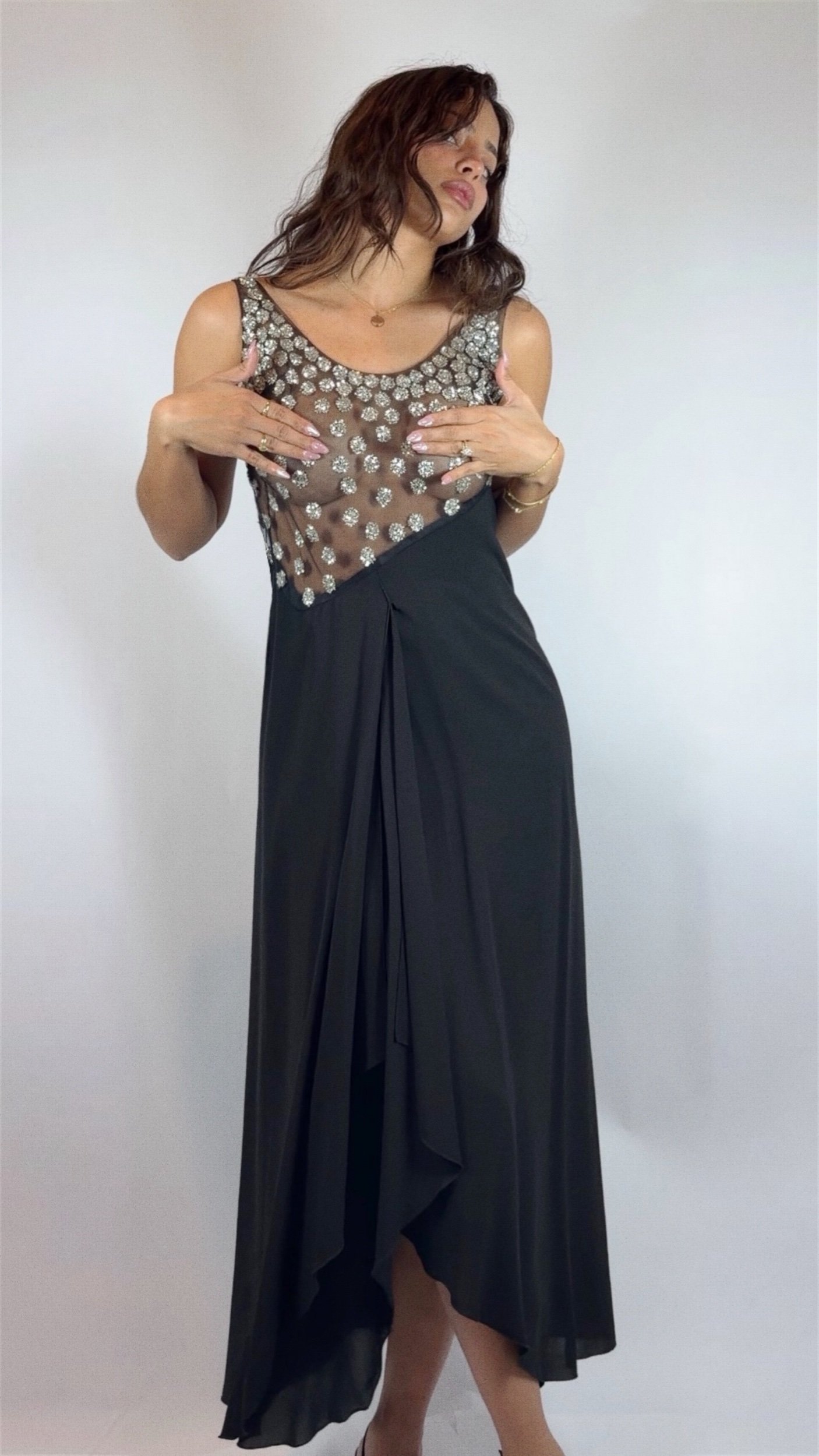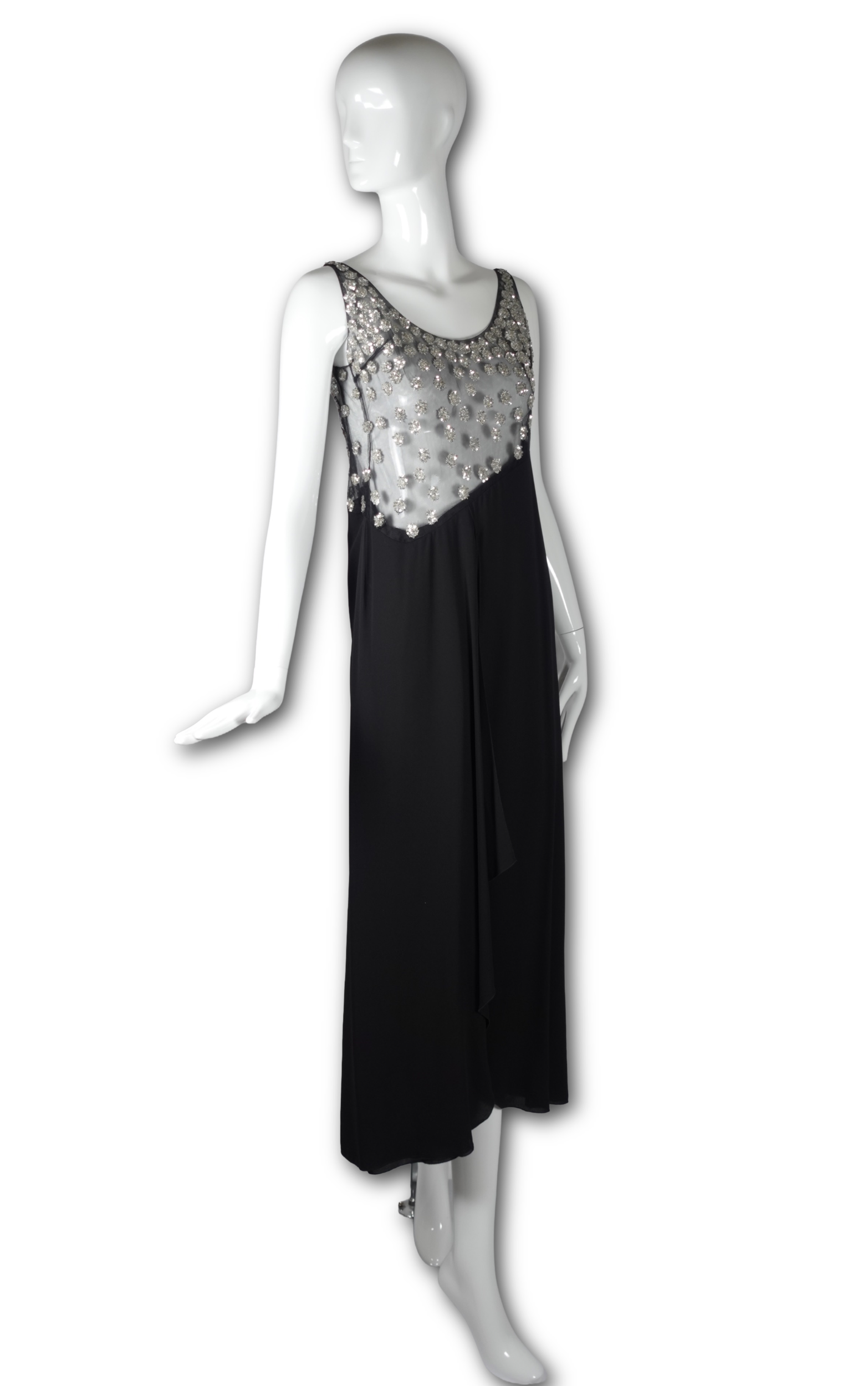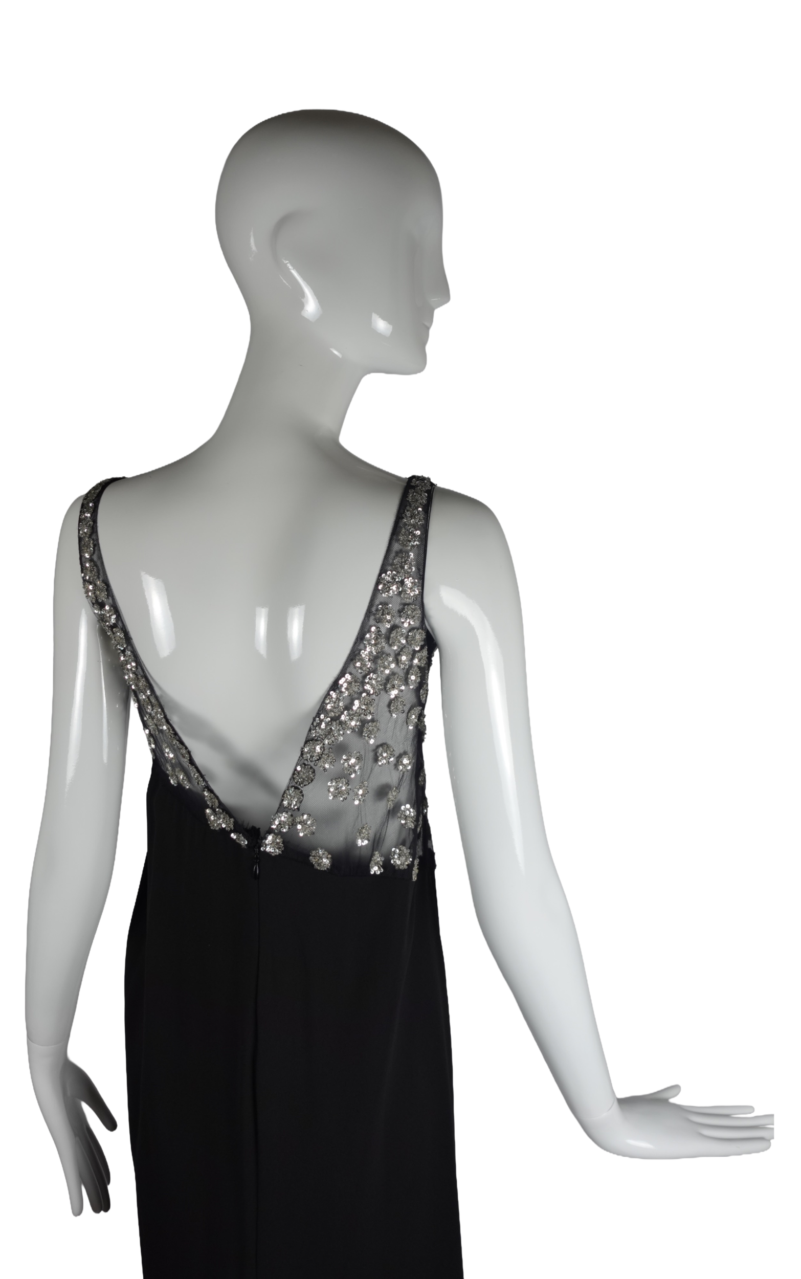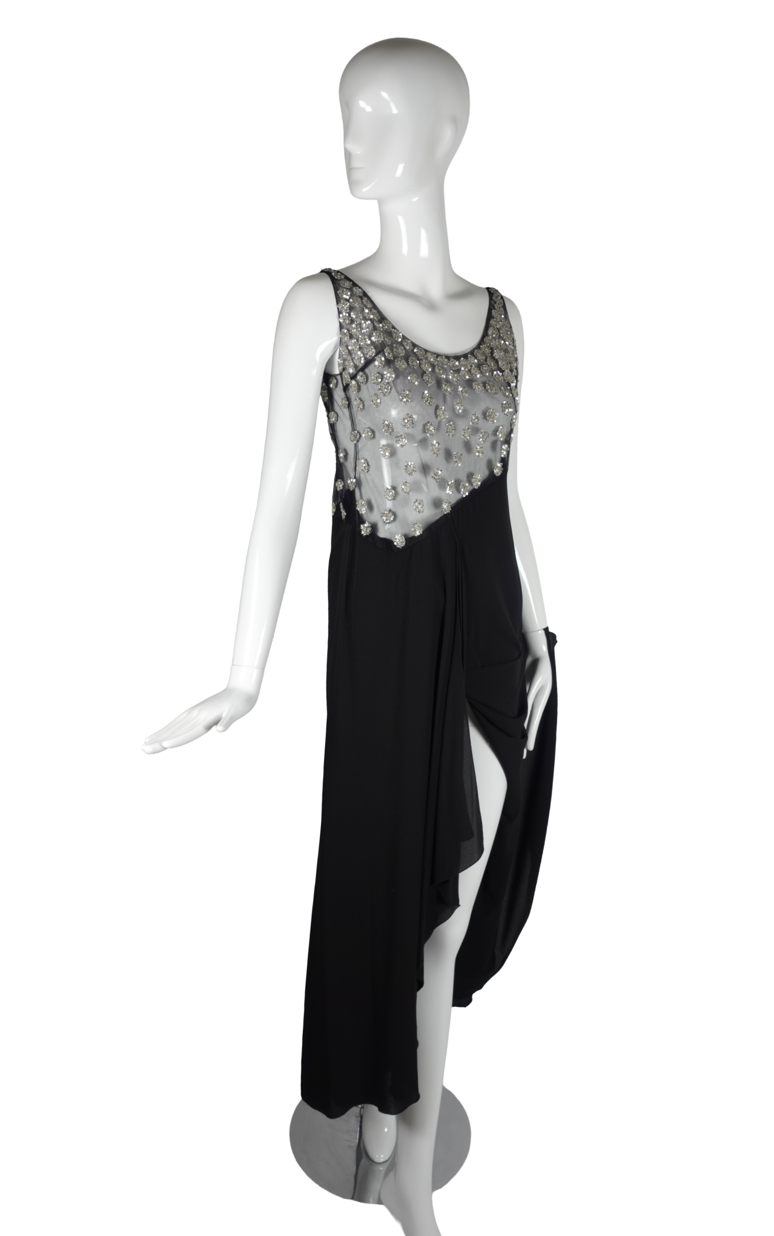 A striking example of Valentino’s mastery of evening wear, this sleeveless maxi gown dates to the late 1990s–early 2000s and exemplifies the house’s signature blend of glamour and refinement. The bodice features a sheer illusion mesh panel densely scattered with silver crystal and sequin floral clusters, creating a luminous, jewel-like effect against the skin. The embellishment graduates from a densely beaded scoop neckline down to a dramatically angled hem that transitions seamlessly into the fluid black crepe skirt below.