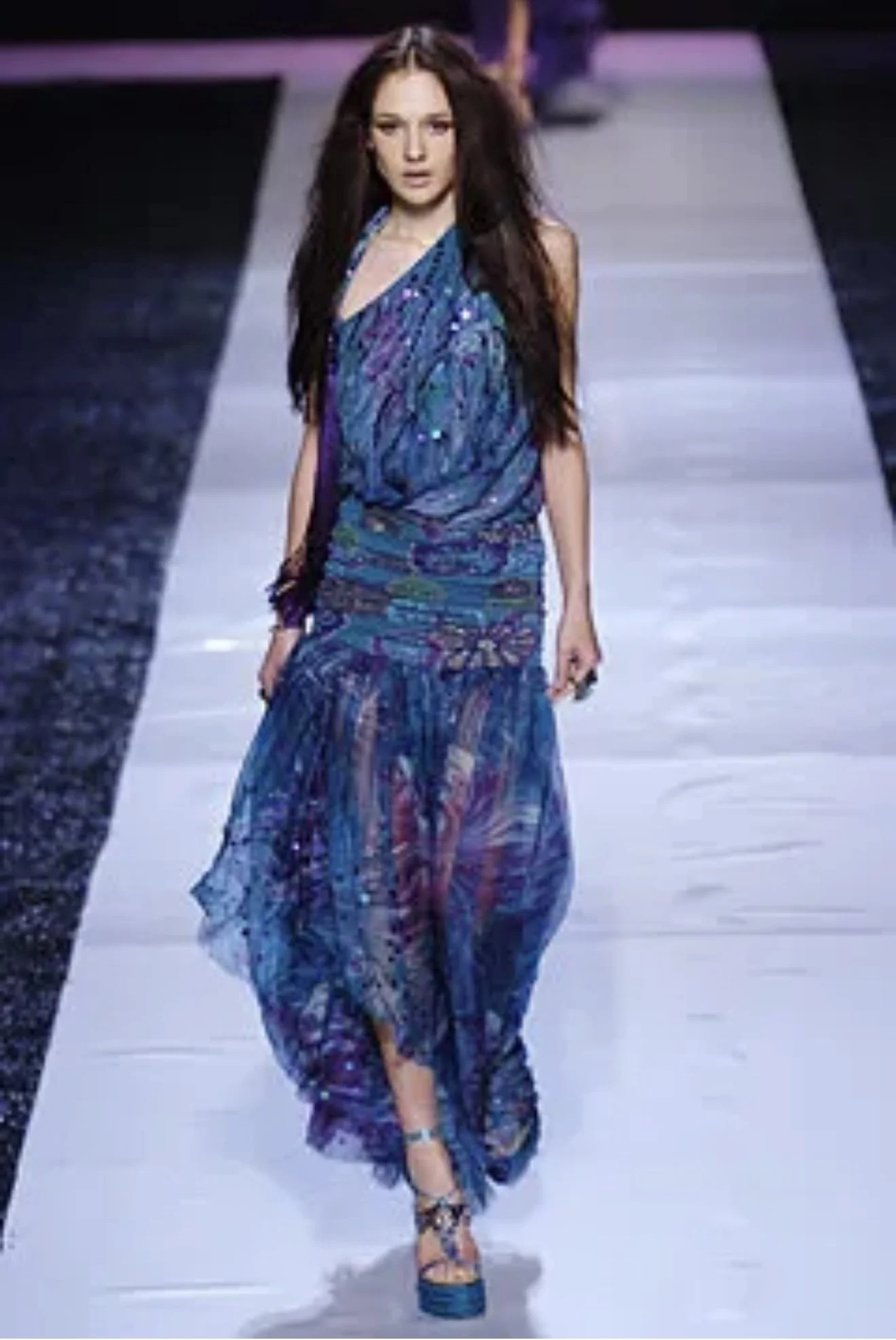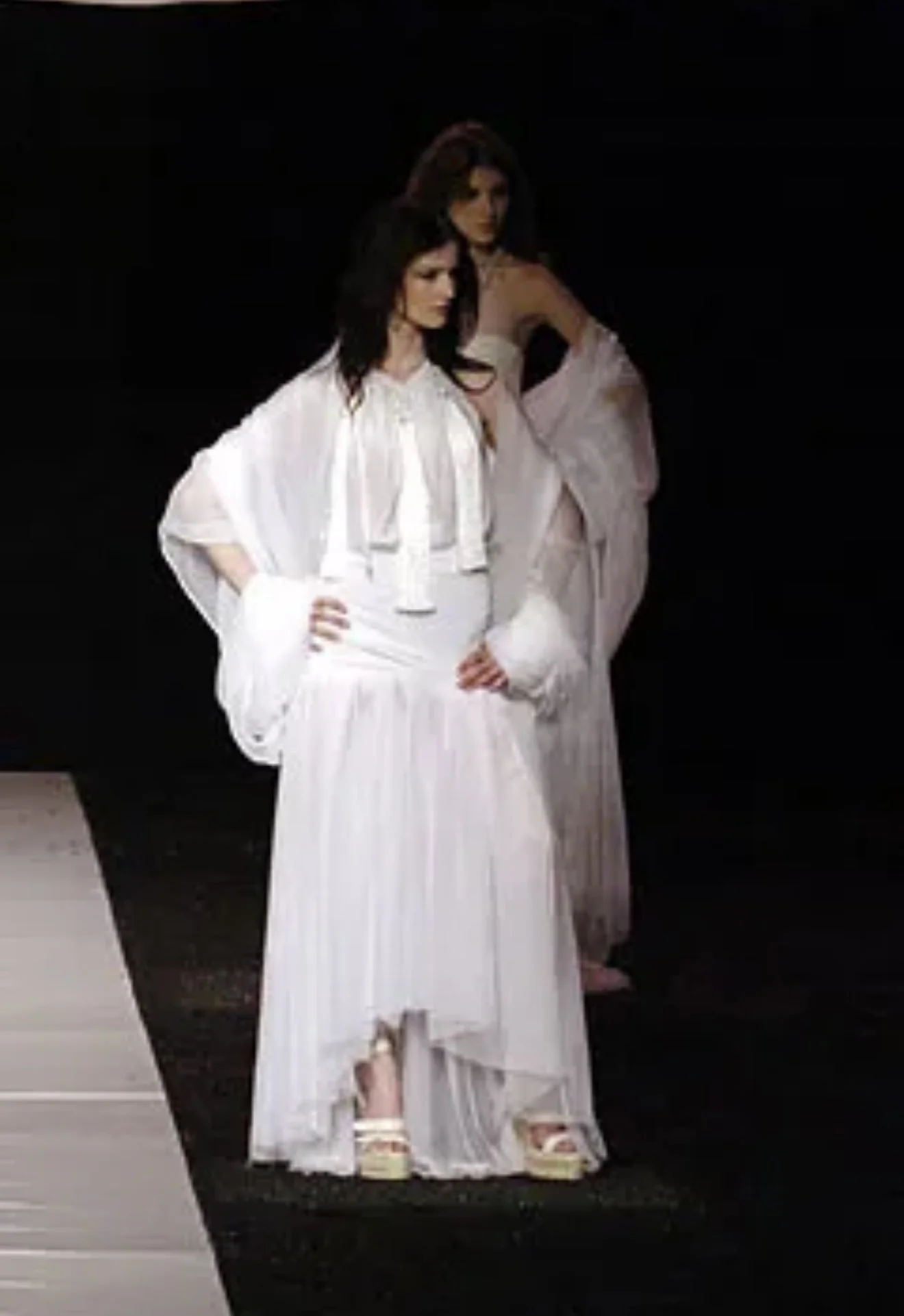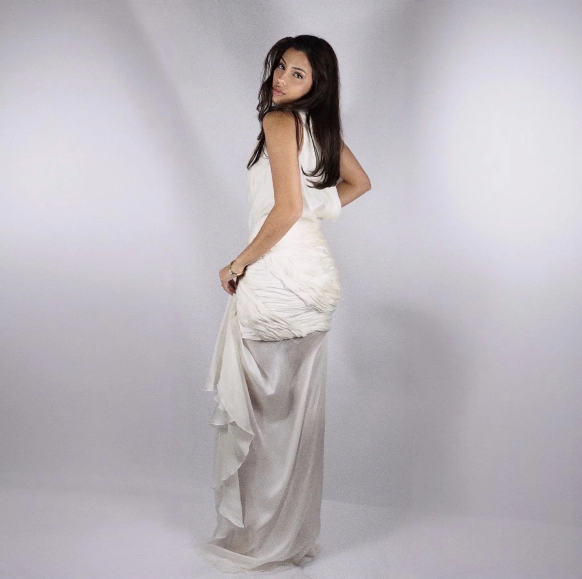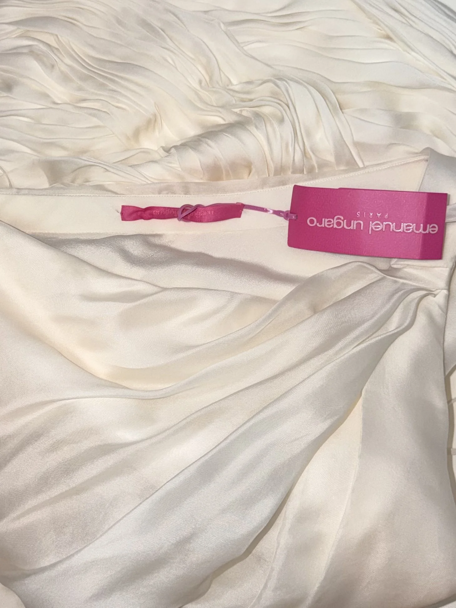 A masterclass in Greco-Roman-inspired glamour, this exquisite Emanuel Ungaro ivory gown embodies the French house’s signature sensuality and sculptural femininity. Crafted from fluid silk chiffon, the gown features a dramatic one-shoulder neckline with softly gathered fabric cascading diagonally across the bodice — evoking the elegance of classical drapery rendered in couture.