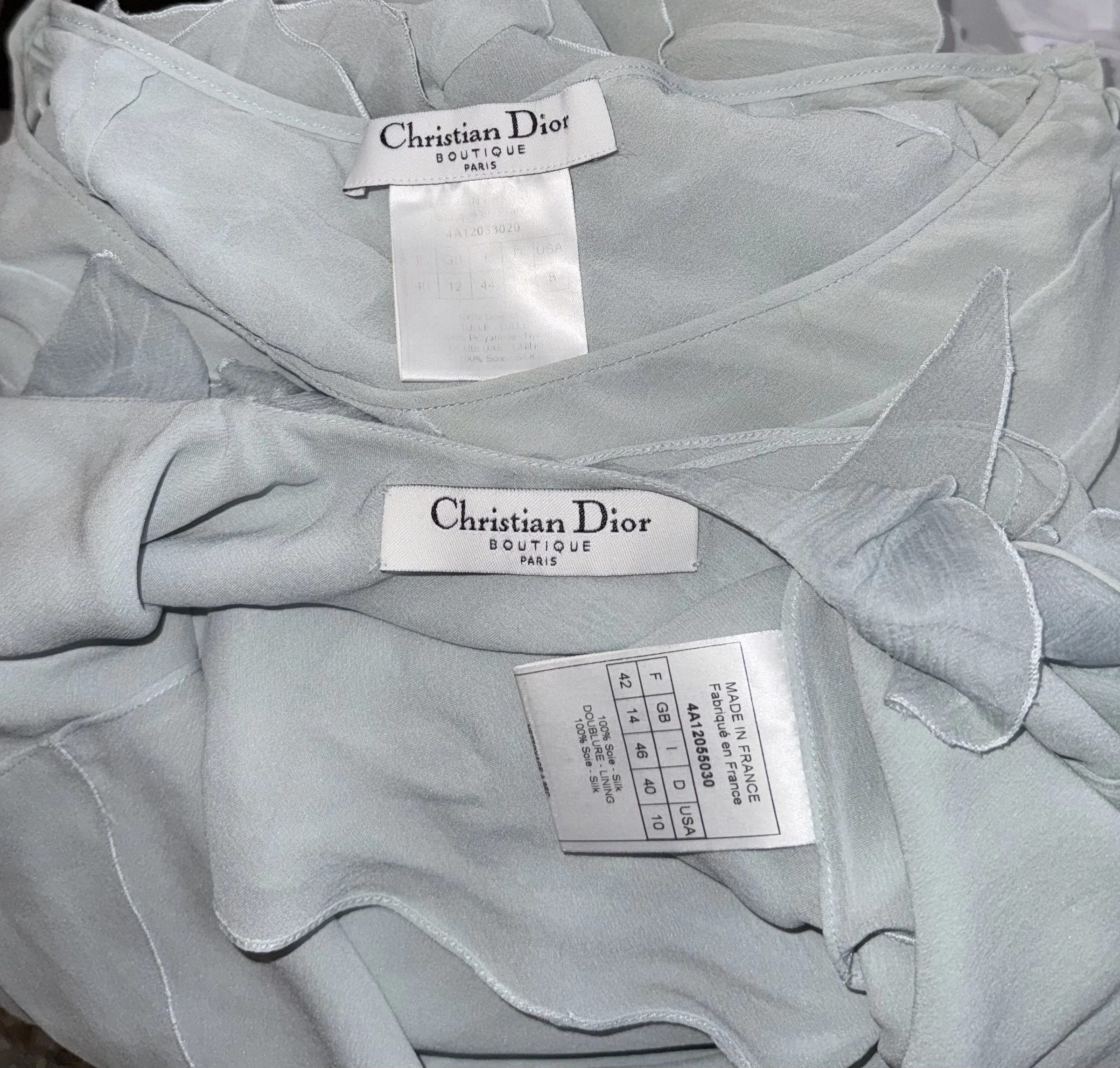 A highly coveted and totally ethereal Christian Dior ice-blue silk and sheer tulle bias-cut set from John Galliano's celebrated 2004 spring-summer collection. The side closes with side covered-buttons. Such a nod to 1930's design! I love the sensual bias cut skirting that emphasizes a woman's seductive shape without adding any bulk or volume to the actual hips. The complex tiered ruffle skirting in particular is a study in dress making. A rare, archival piece of John Galliano fashion history.