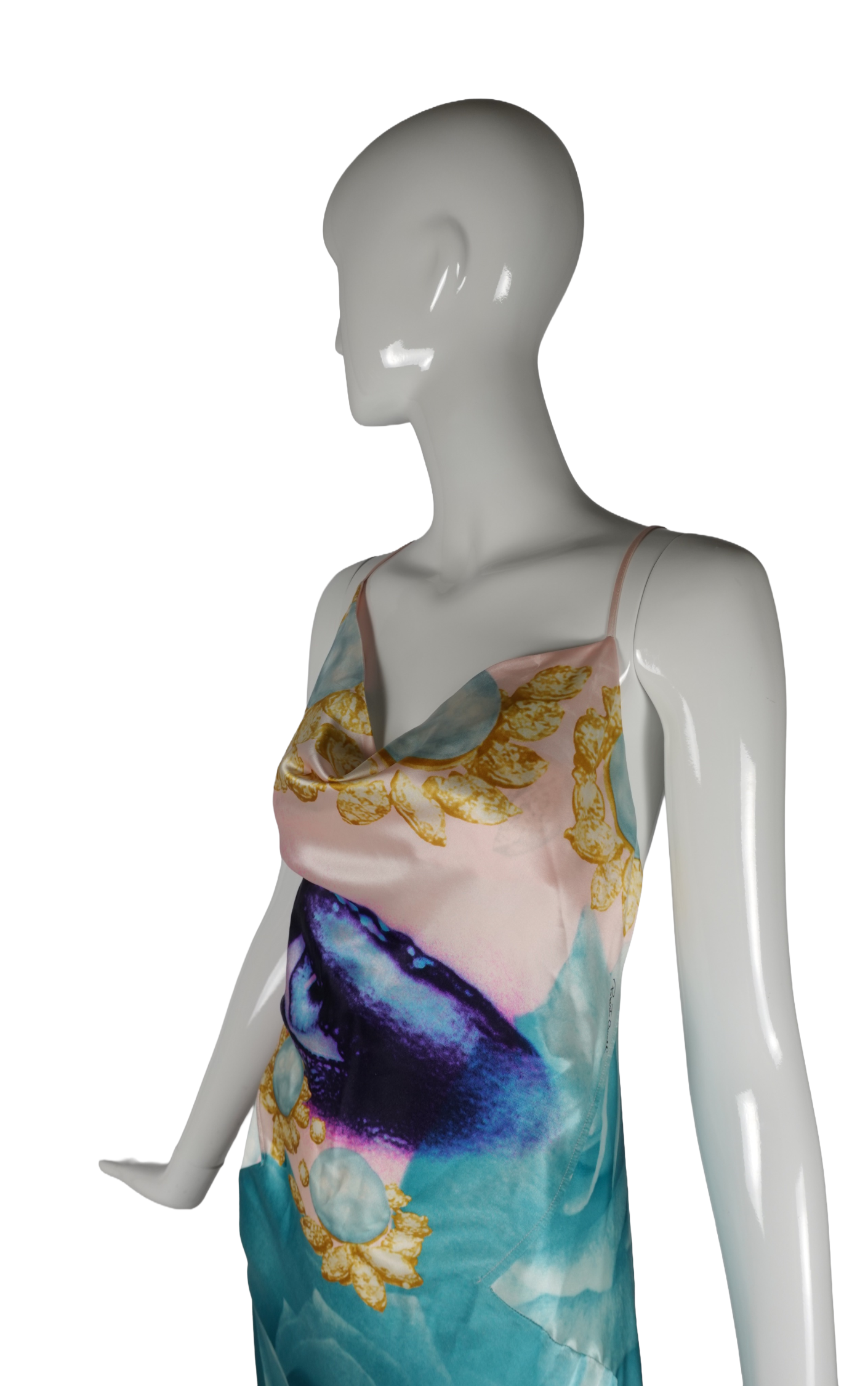 Roberto Cavalli S/S 2001 “Liz Taylor” Iconic Runway Bias-Cut Silk Slip Dress — Elizabeth Taylor Eye, Blue Rose & Pearl Print