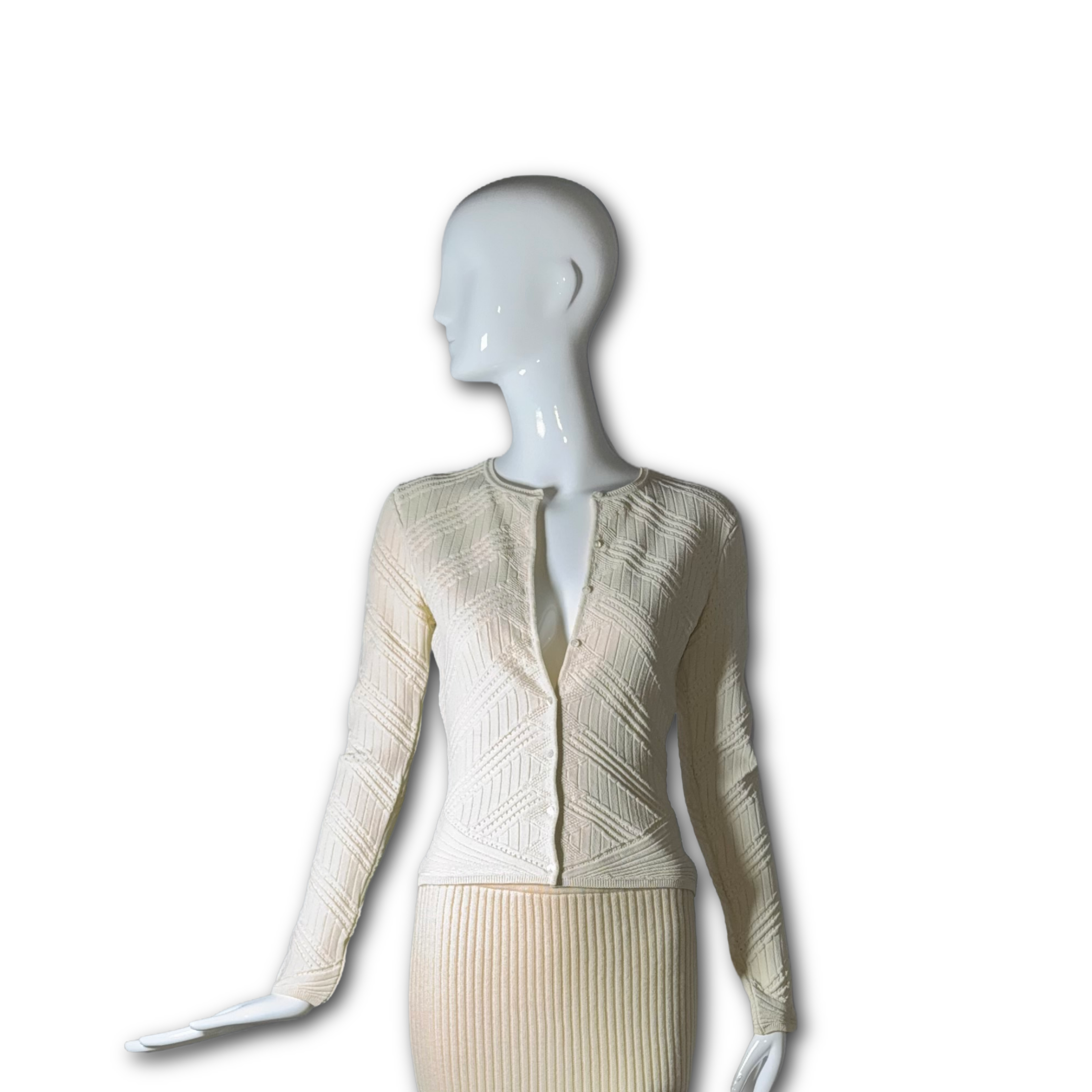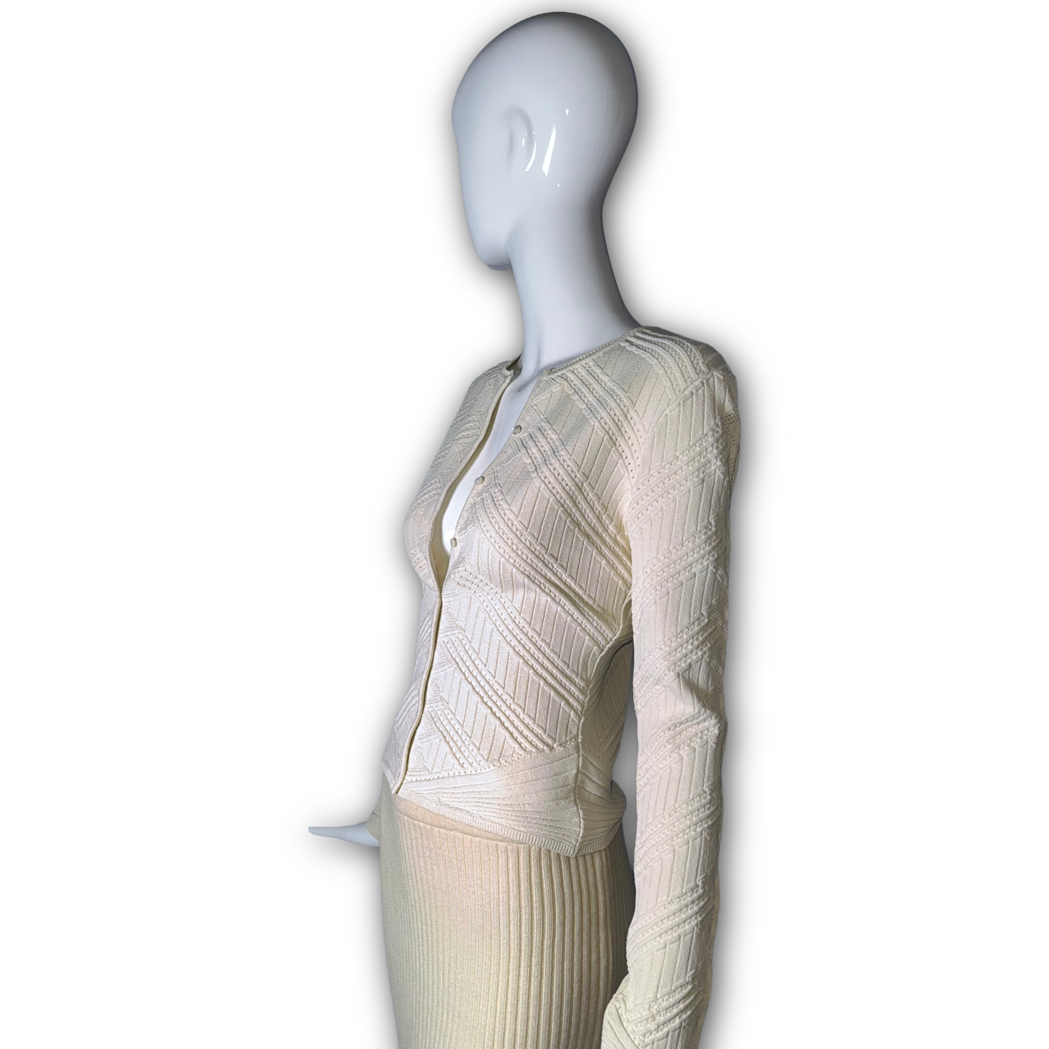 A stunning piece from Galliano’s Dior era, this ivory cropped cardigan features an intricate all-over diamond pointelle and raised cable-knit pattern that creates striking geometric texture across the entire body. The second-skin stretch construction and center-front button placket are quintessentially early 2000s — effortlessly sensual and sculpted. Finished with a ribbed waist band and long fitted sleeves.
