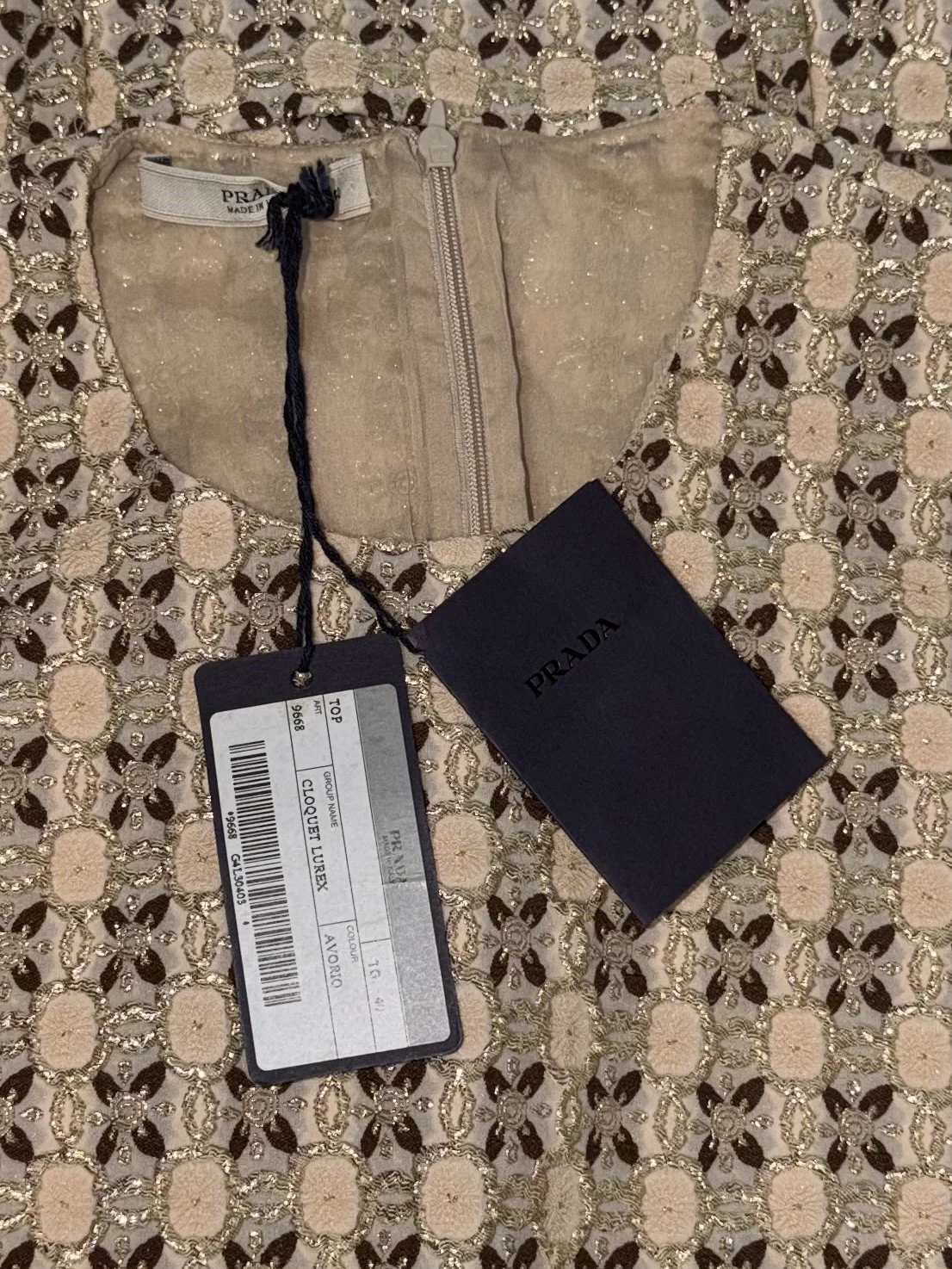 This exquisite two-piece co-ord set is crafted from a richly woven ivory brocade interlaced with luminous gold metallic thread, creating an all-over geometric lattice pattern that catches and reflects light with every movement. The fabric possesses a sculptural weight and quiet opulence entirely characteristic of Prada's early 2000s approach to dressed sportswear — elevated yet effortless.