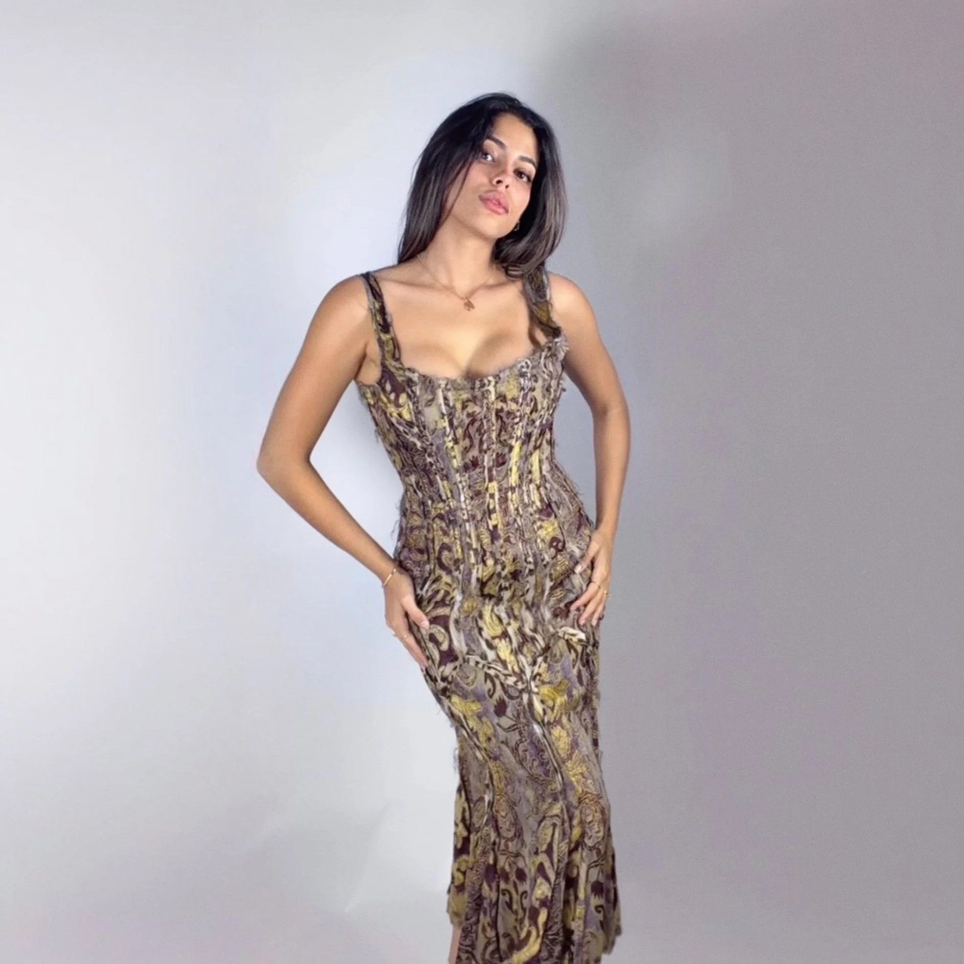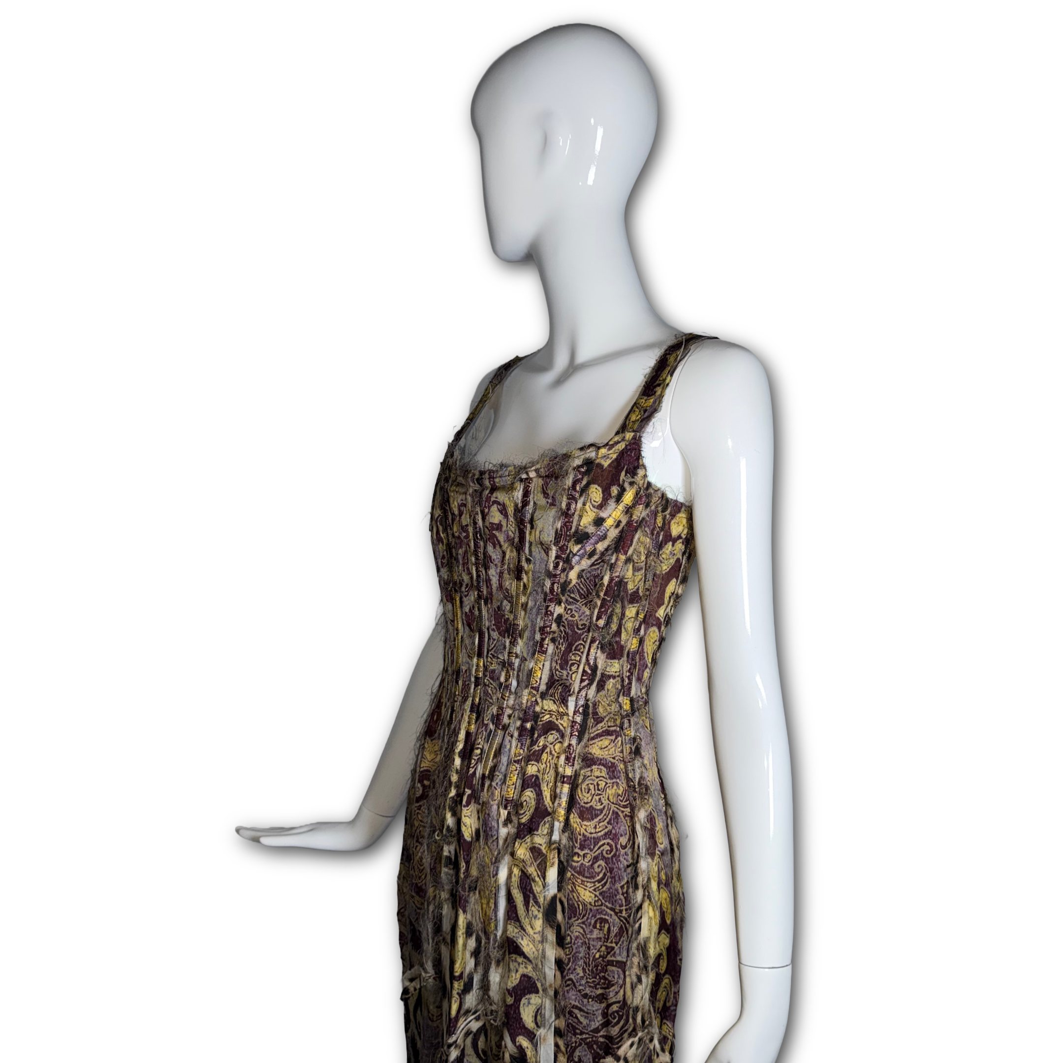 Rare Roberto Cavalli Fall/Winter 2004 runway dress, new with original tags. This stunning piece features an allover baroque tapestry print in rich tones of deep plum, gold, and taupe on a semi-sheer base. The structured boned corset bodice is adorned with vertical seaming and raw fringe trim detailing along the neckline and straps, lending the piece its signature Cavalli sensuality. The skirt flows into a mermaid silhouette with a dramatic flared hem and intentional raw-edge fraying throughout, a hallmark of this collection. The back features a lace-up corset closure for an adjustable, ultra-cinched fit.