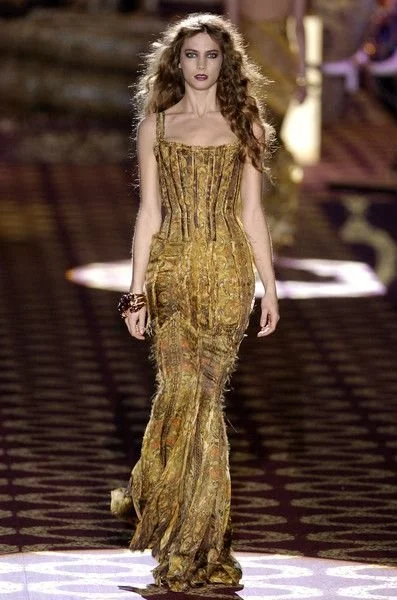 As seen on the FW2004 runway, this dress exemplifies Cavalli’s maximalist vision, blending Renaissance-inspired opulence with a rock-and-roll edge. An extraordinary collector’s piece in unworn condition.