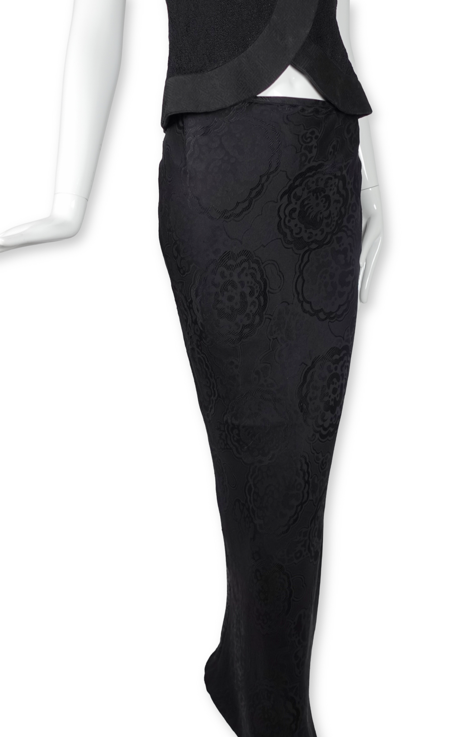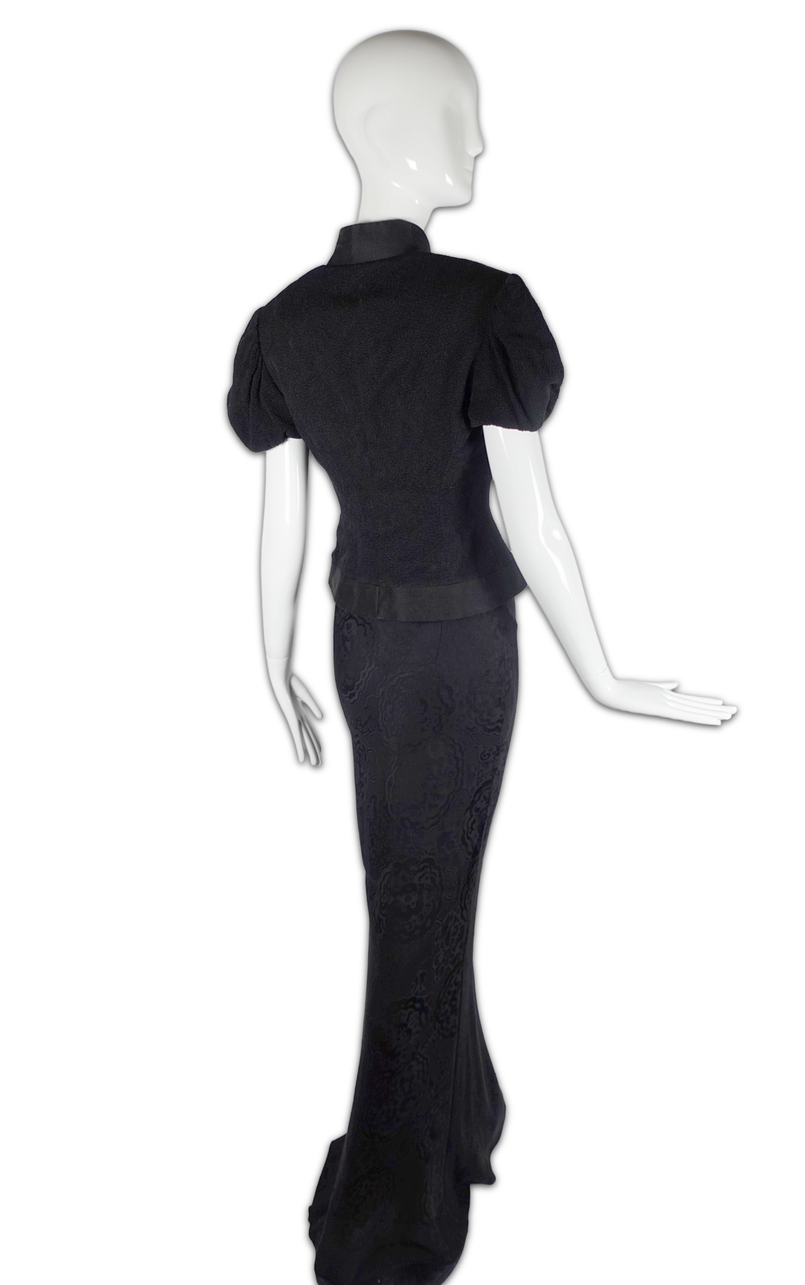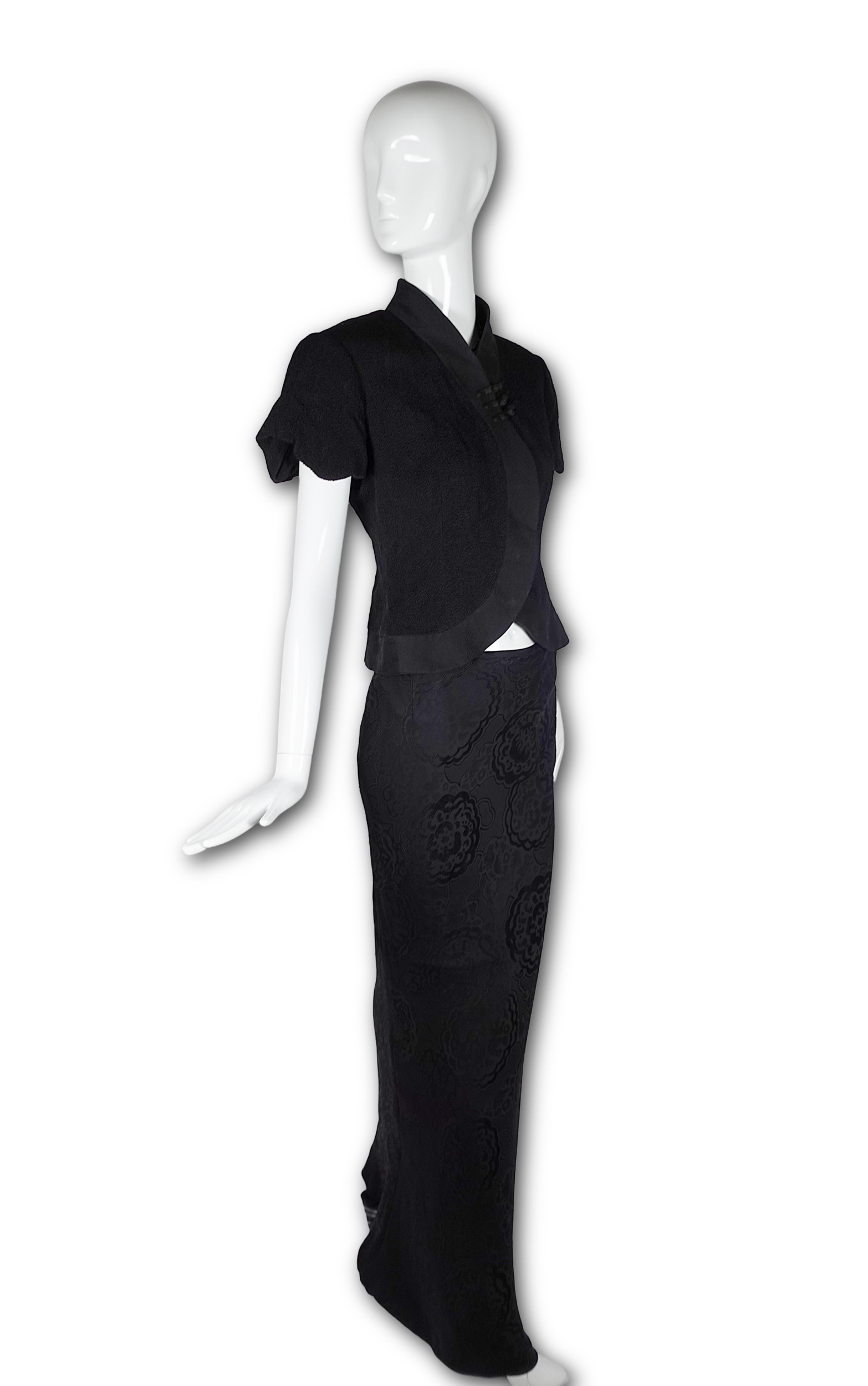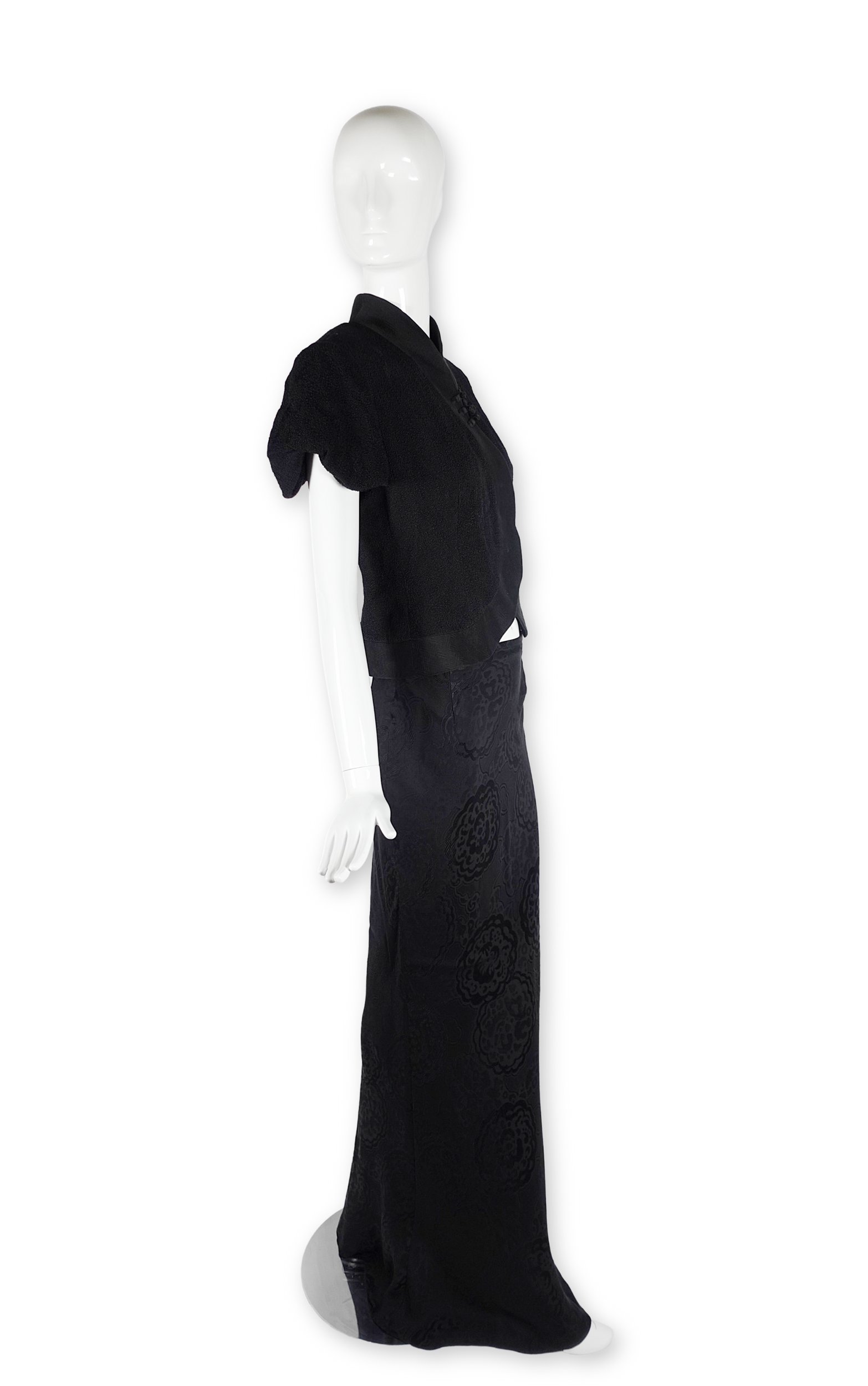 The jacket's defining feature is its curving, crossover cut — a silhouette that comes in at the waist and flares beautifully over the top of the hip. The skirt falls to the floor in a sweeping maxi length, its fabric woven with a subtle allover floral jacquard — a tone-on-tone pattern that catches the light with every movement. Together, the set carries a powerful sense of Eastern influence.