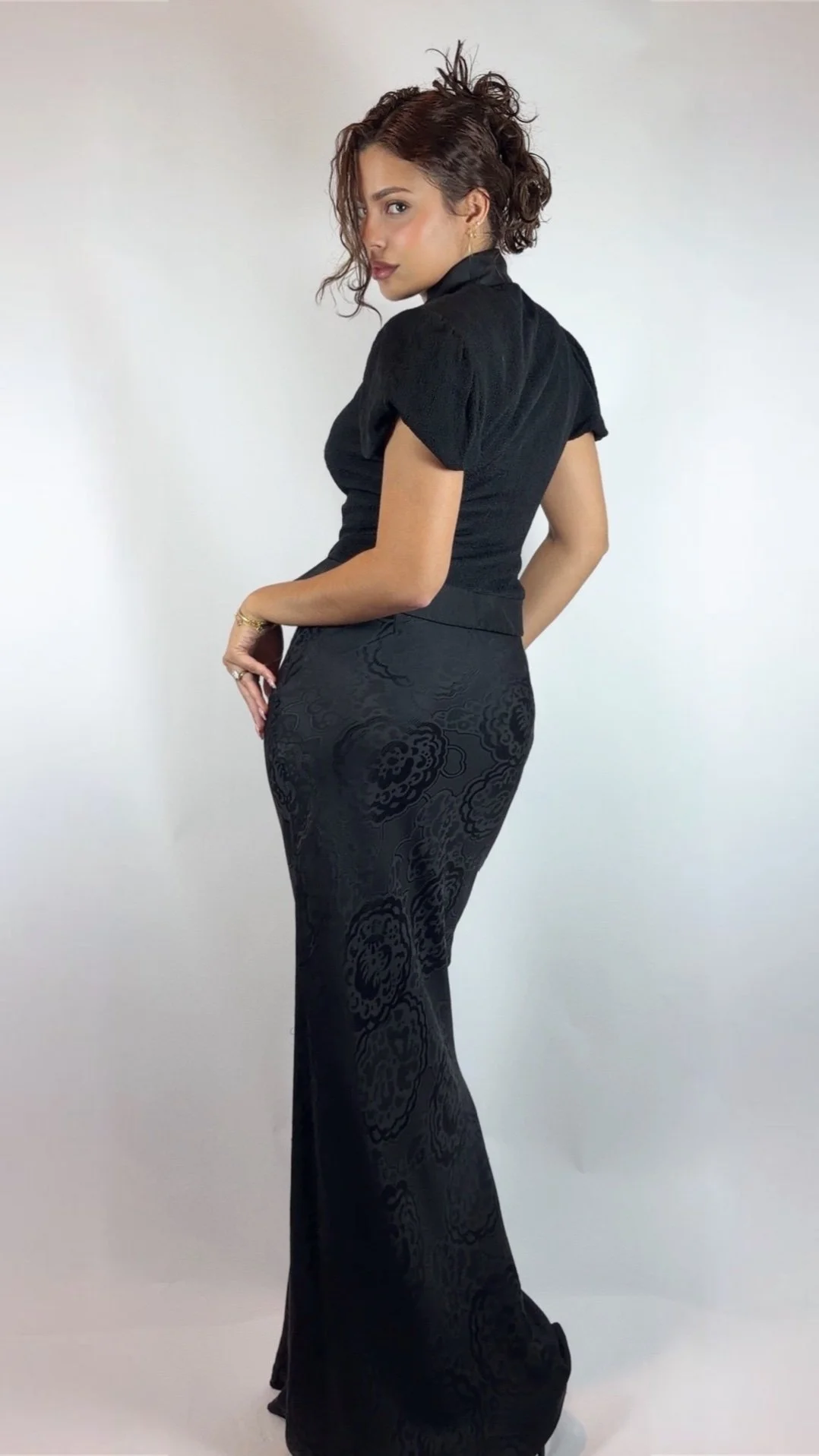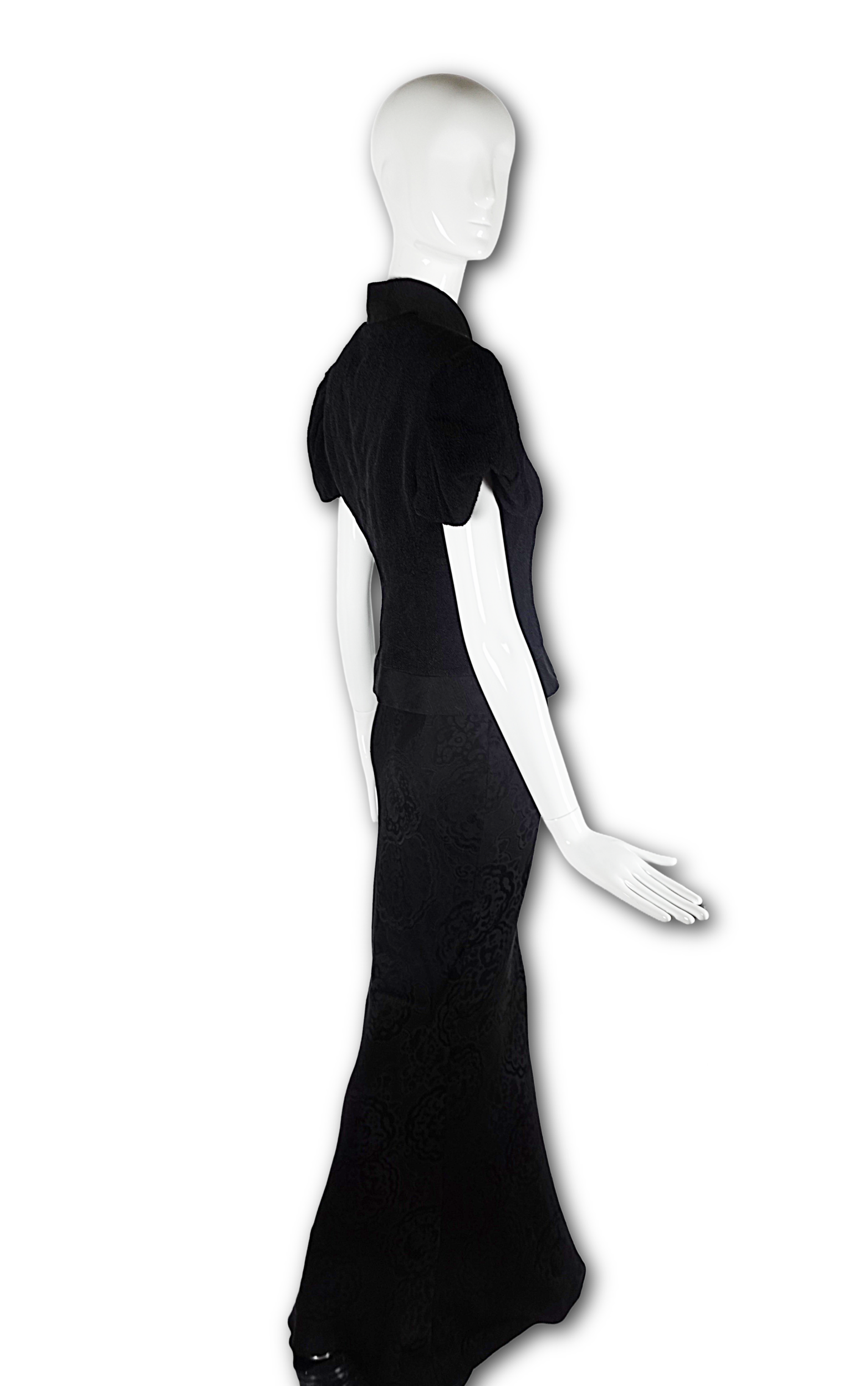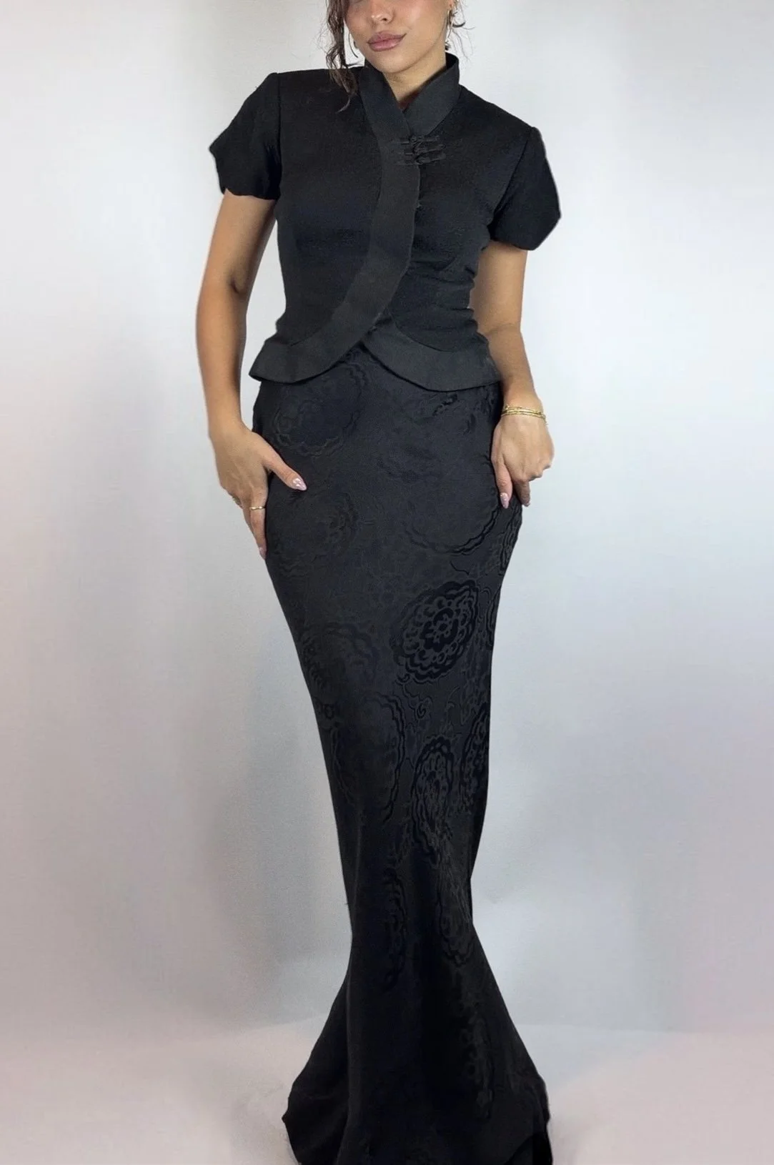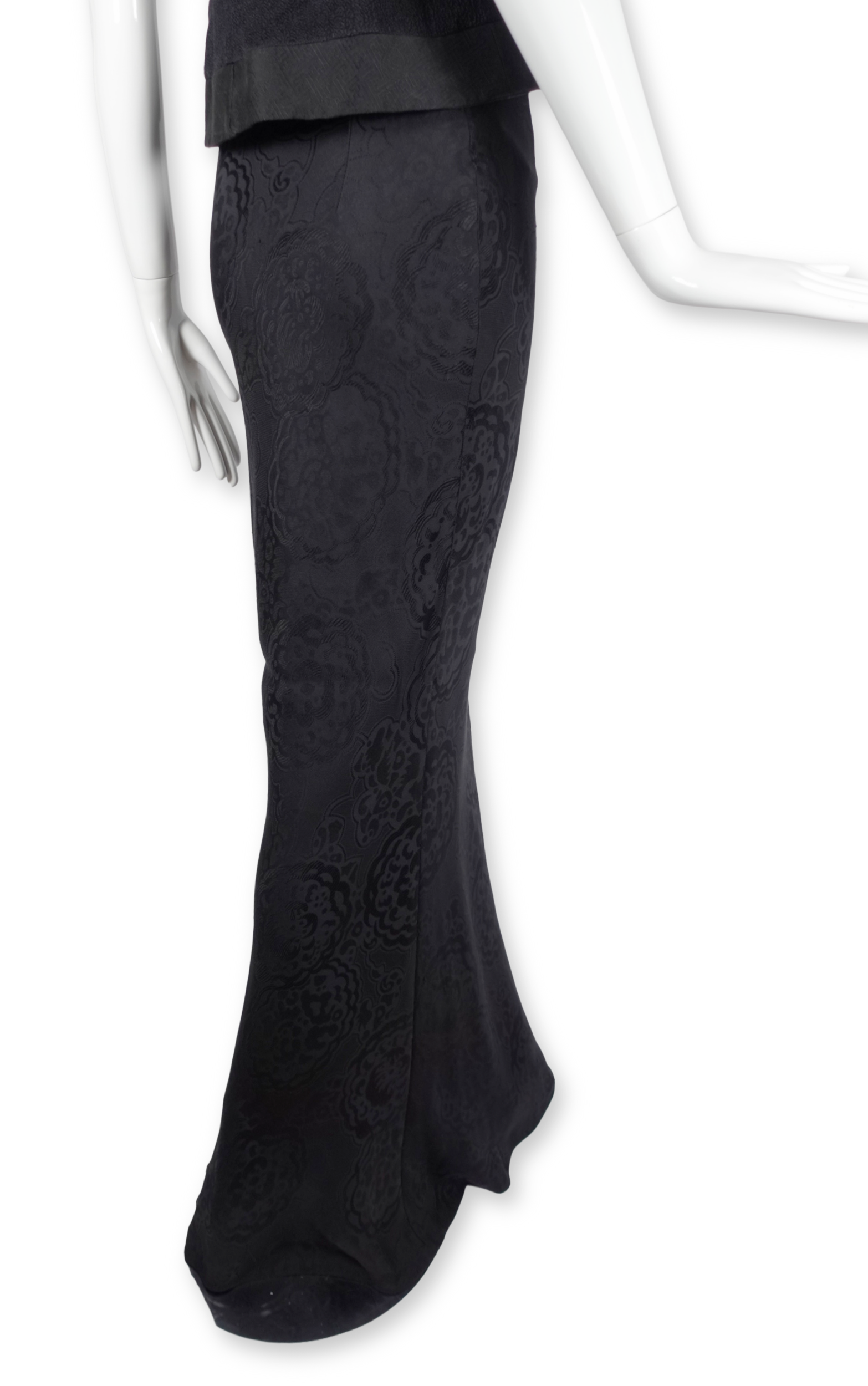 The jacket's defining feature is its curving, crossover cut — a silhouette that comes in at the waist and flares beautifully over the top of the hip. The skirt falls to the floor in a sweeping maxi length, its fabric woven with a subtle allover floral jacquard — a tone-on-tone pattern that catches the light with every movement. Together, the set carries a powerful sense of Eastern influence.