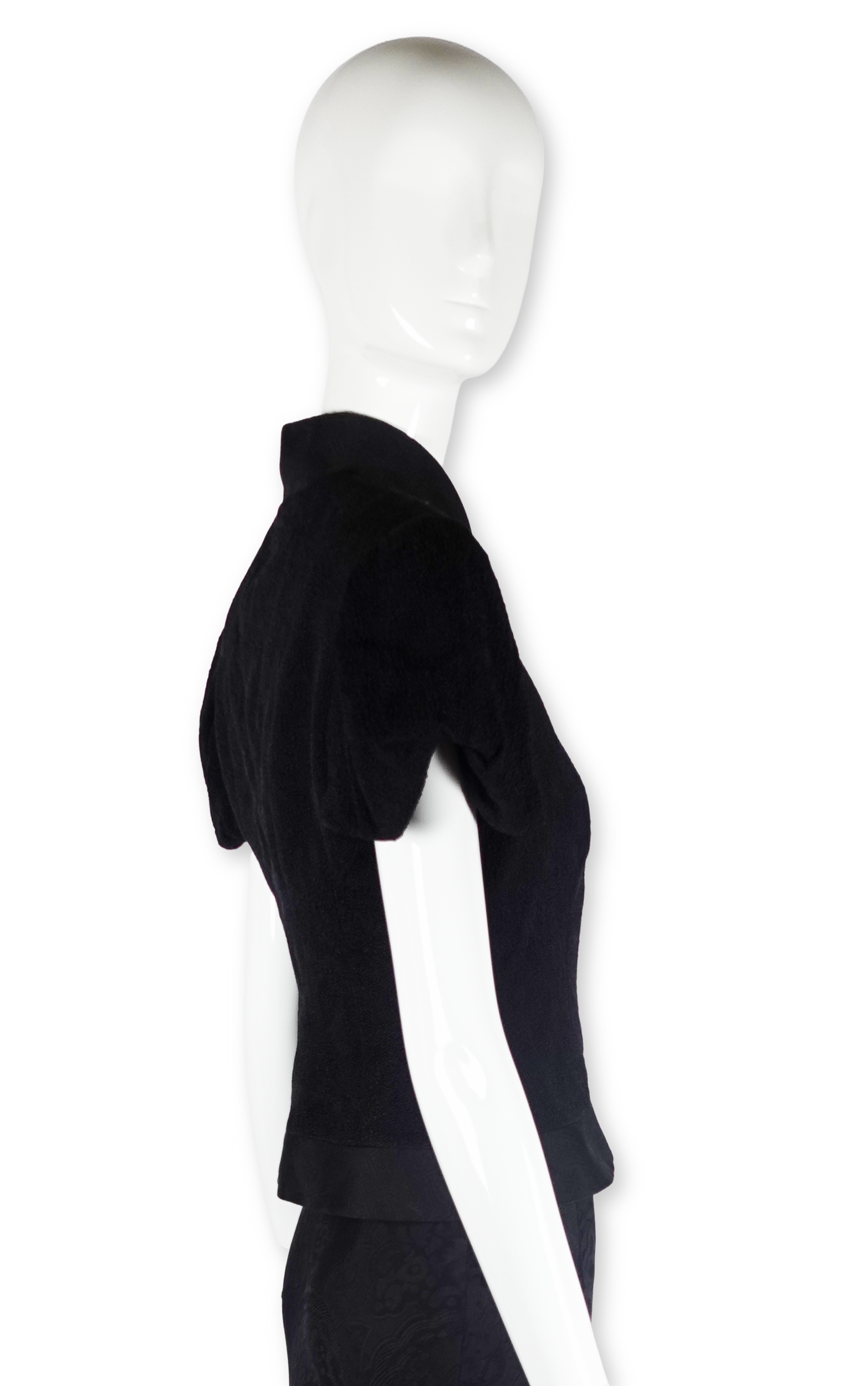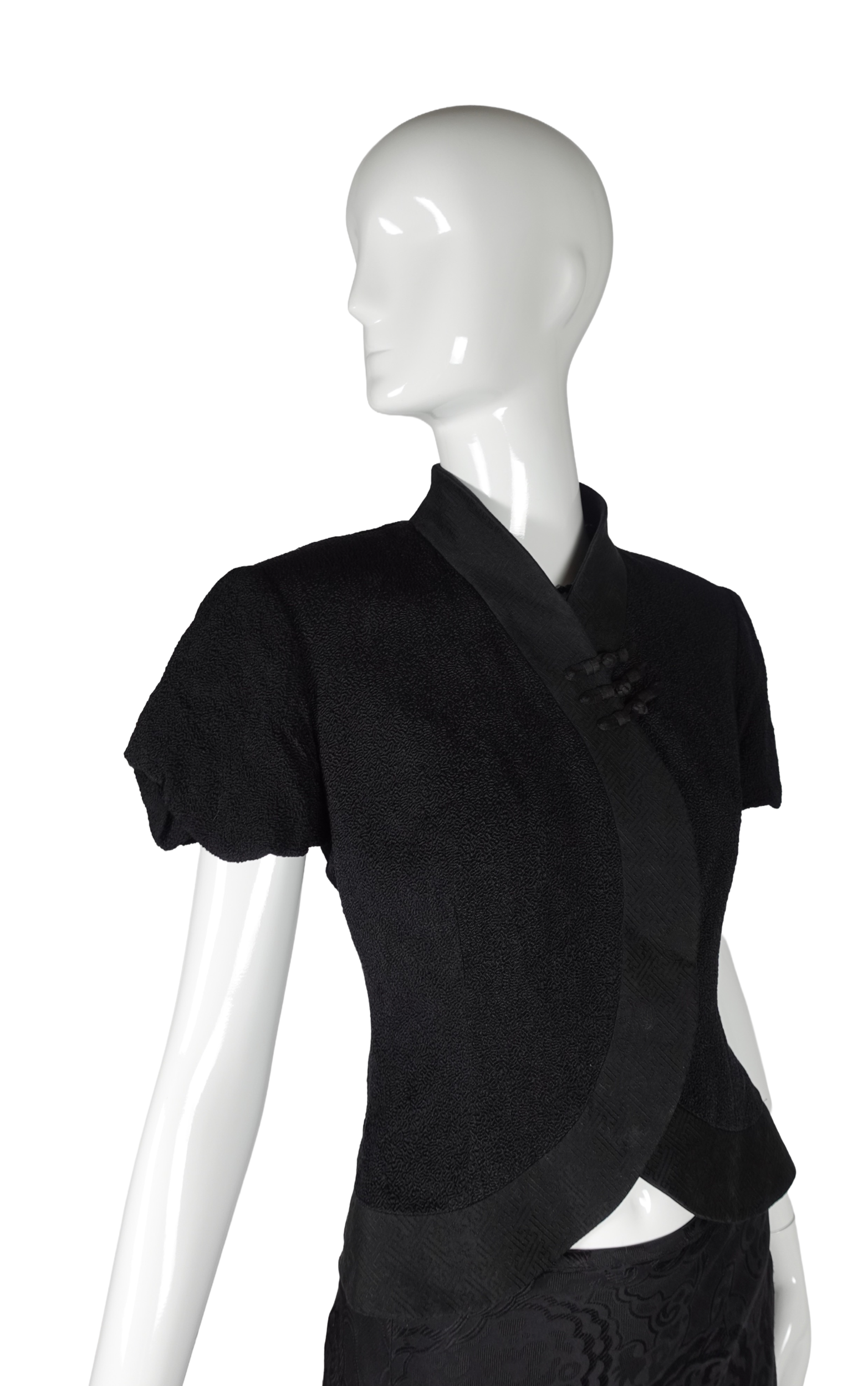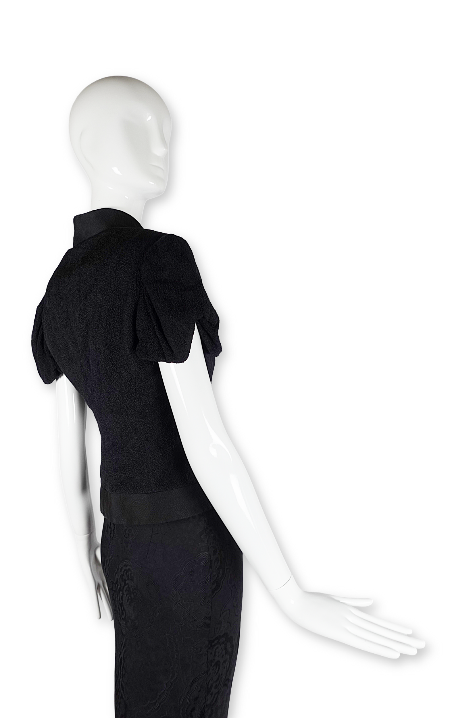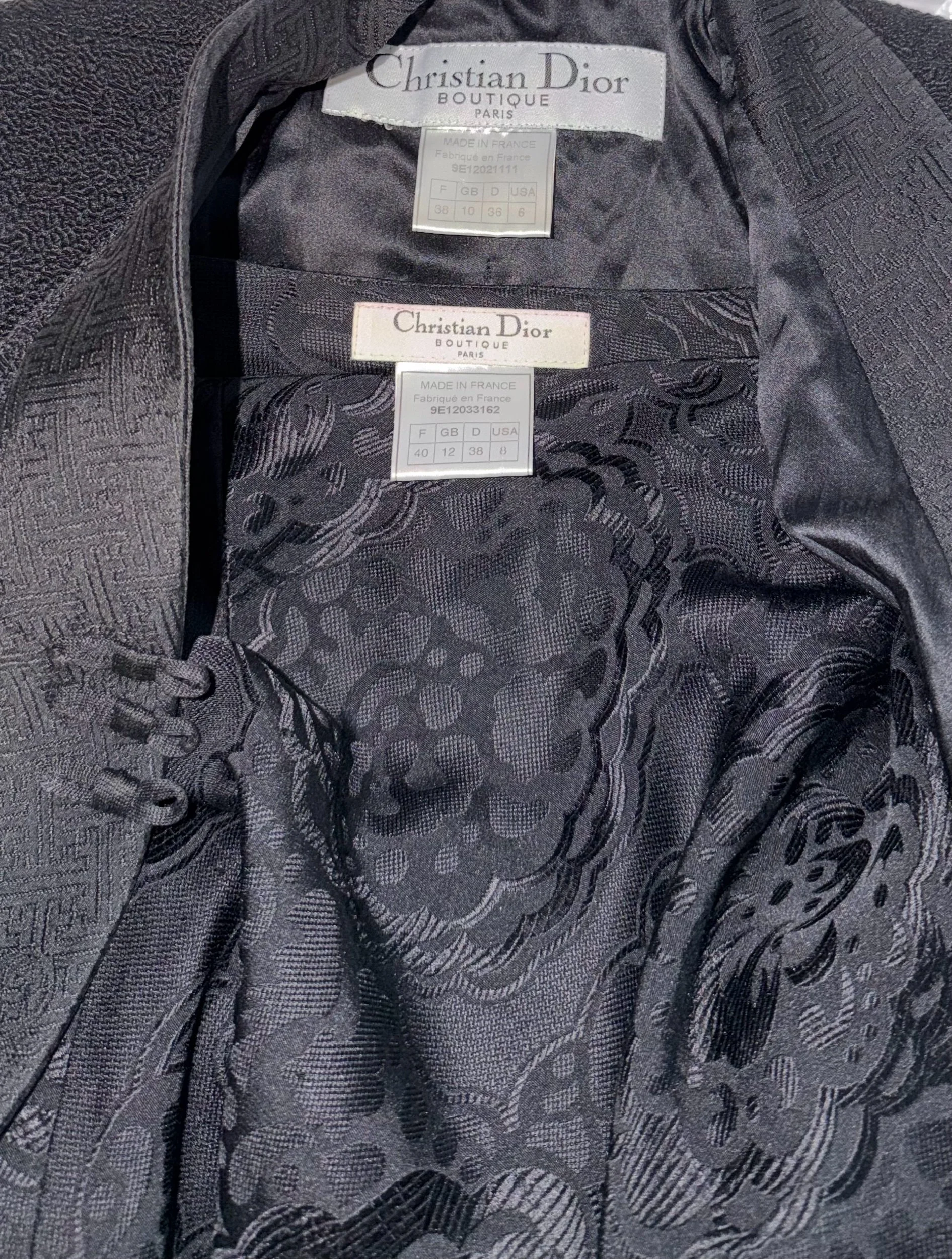 The jacket's defining feature is its curving, crossover cut — a silhouette that comes in at the waist and flares beautifully over the top of the hip. The skirt falls to the floor in a sweeping maxi length, its fabric woven with a subtle allover floral jacquard — a tone-on-tone pattern that catches the light with every movement. Together, the set carries a powerful sense of Eastern influence.
