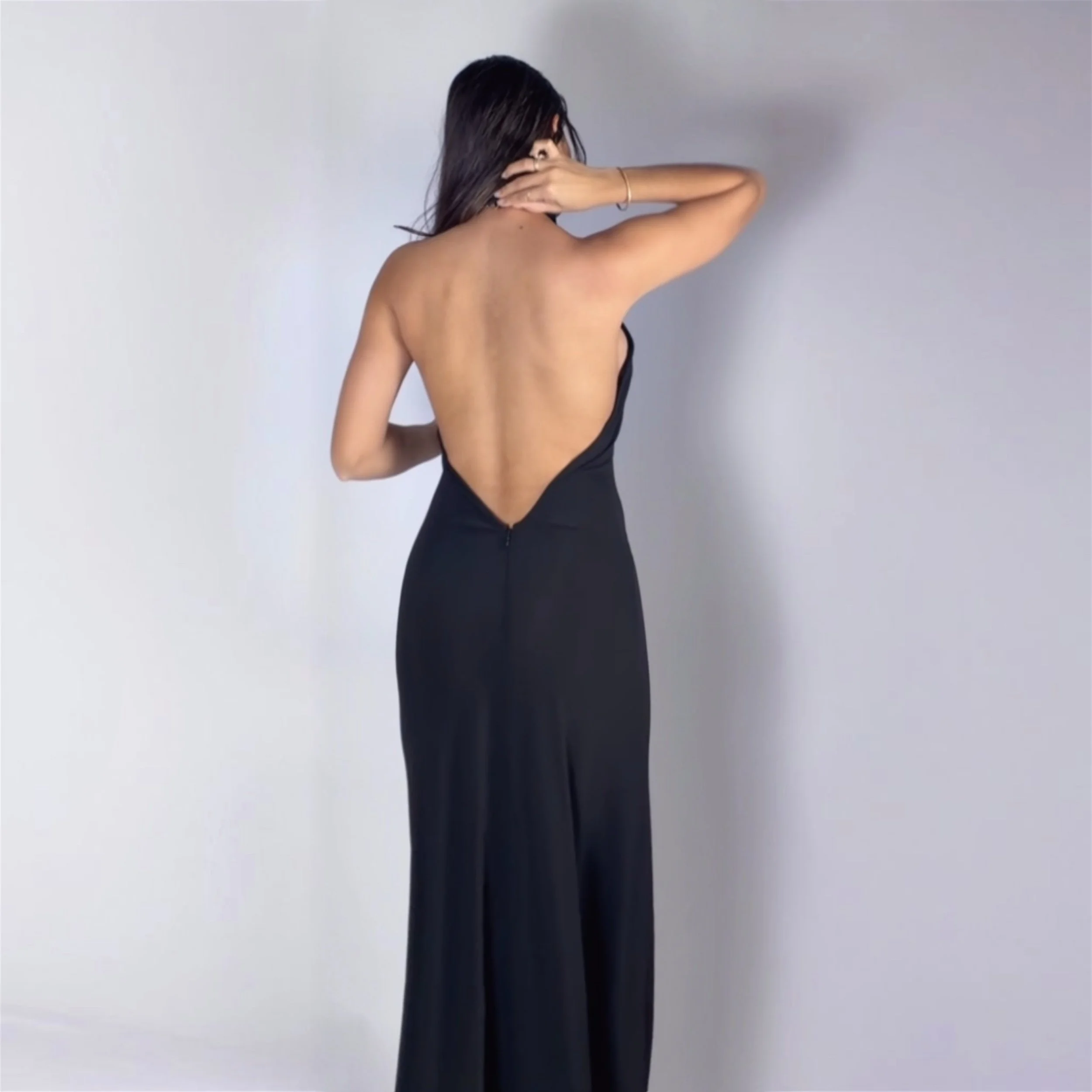 A masterclass in minimalist sensuality, this floor-length halter gown from Dolce & Gabbana’s Spring/Summer 2001 collection embodies the era’s obsession with understated glamour. Crafted in fluid black jersey, the dress features a high mock-neck halter that wraps softly around the throat, while the back plunges dramatically to the lower spine in a deep V, a signature tension between modesty and exposure that defined the house’s aesthetic at the turn of the millennium.