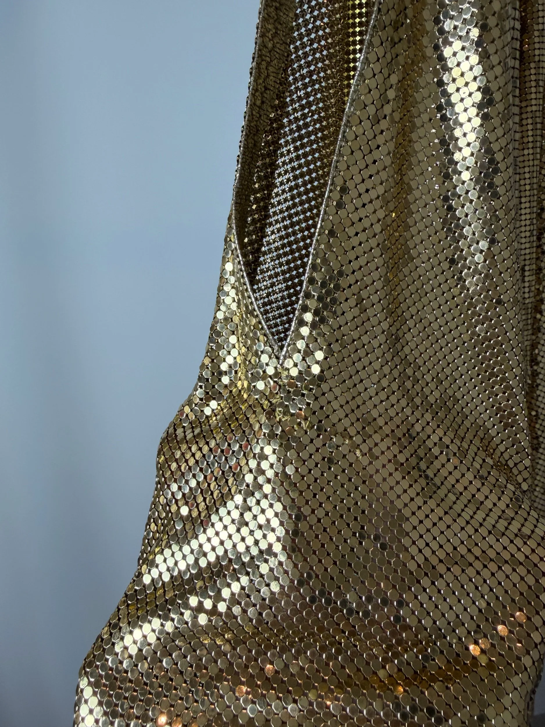 Step into liquid gold with this stunning 1994 Gianni Versace Oroton metallic mesh mini dress — a true artifact of ‘90s high-glamour fashion. Crafted from Oroton’s signature chainmail-style metal mesh, this dress drapes and moves like a second skin, catching light from every angle with an undeniable glamour that feels just as relevant today as it did when it first graced the decade’s most iconic runways and editorial shoots.