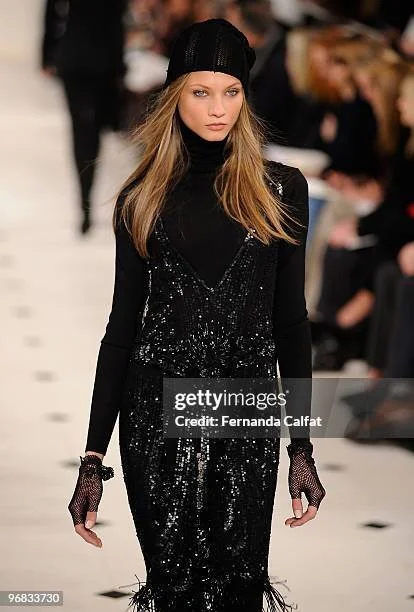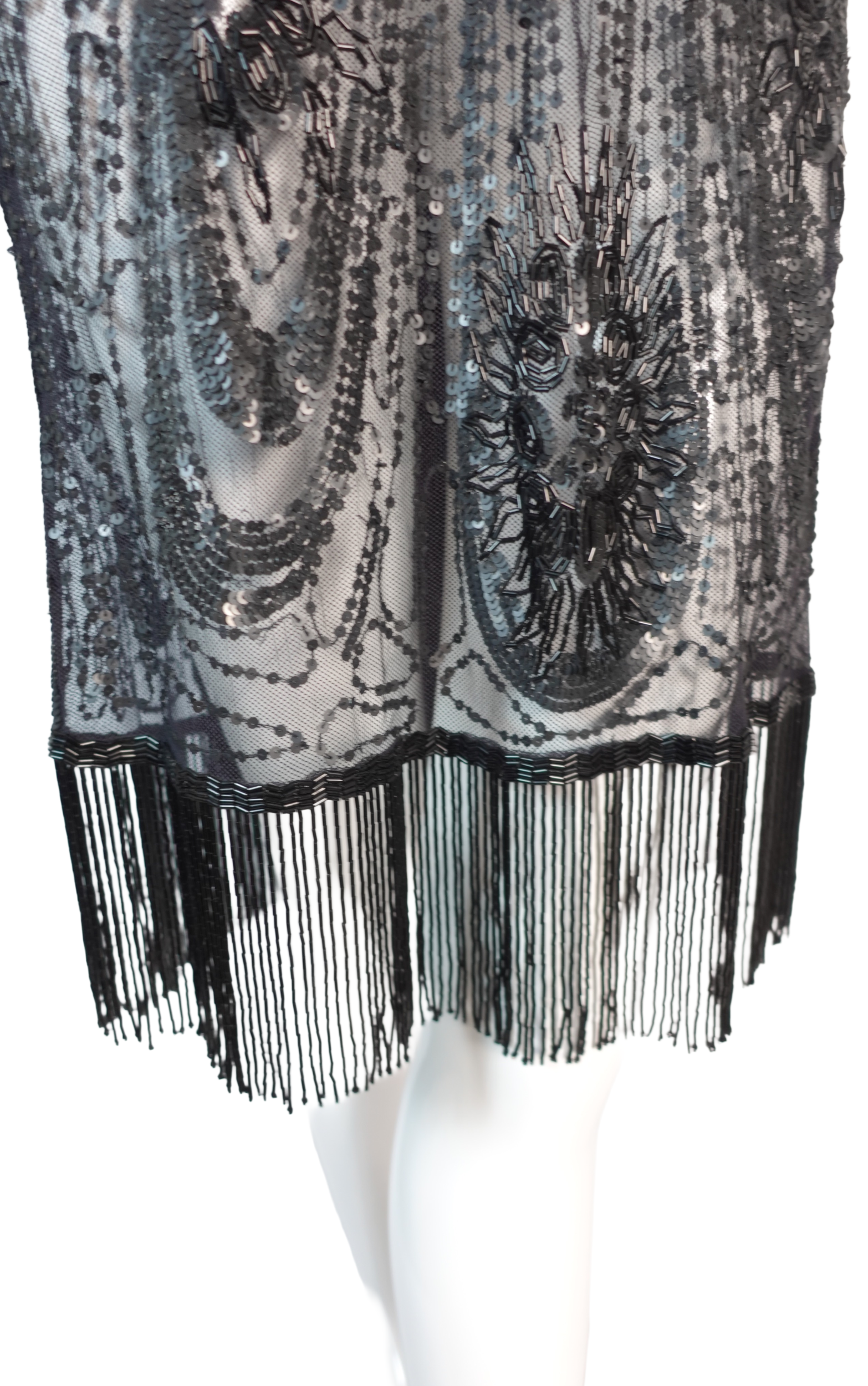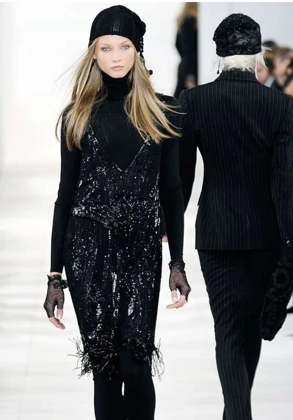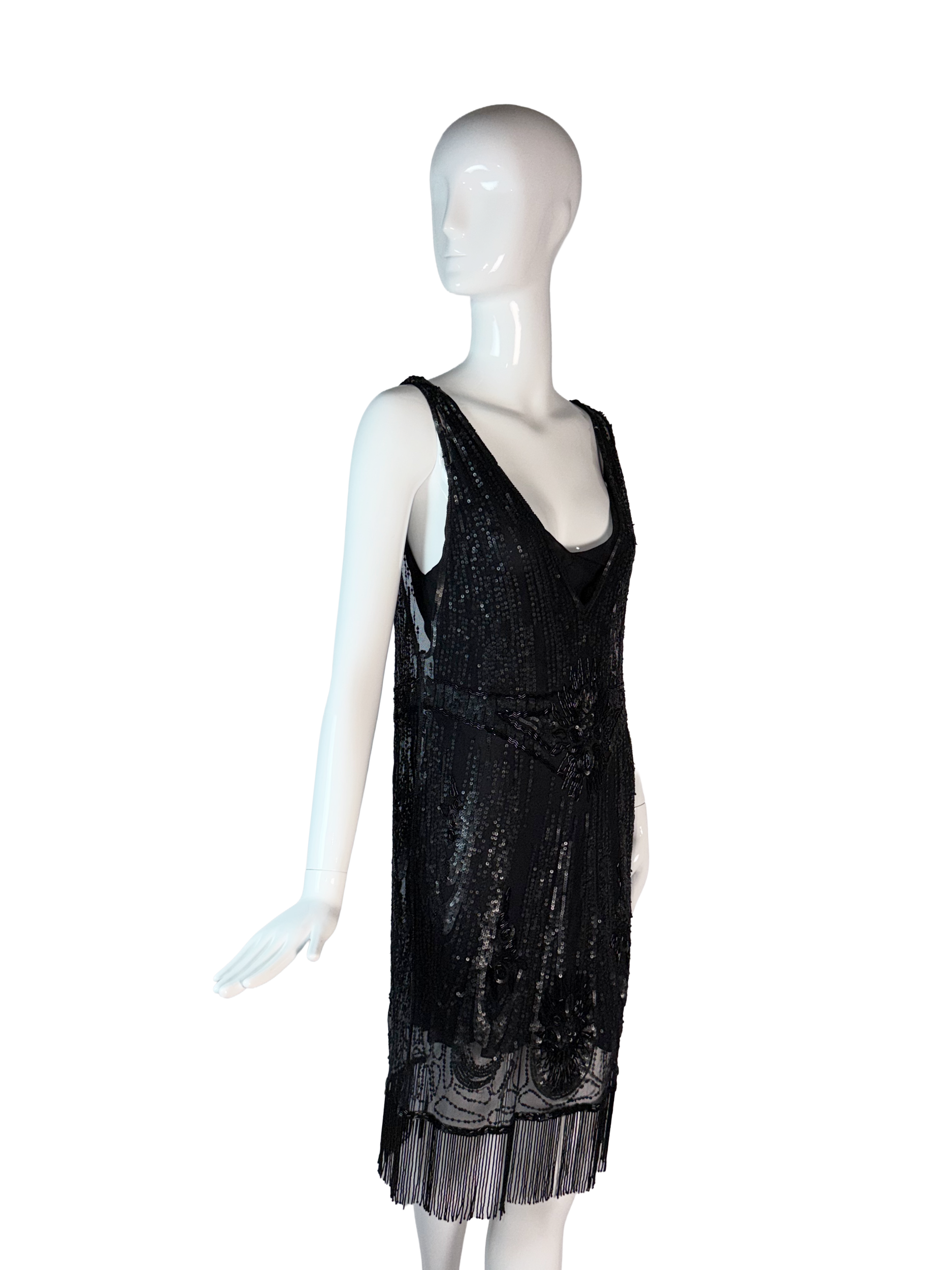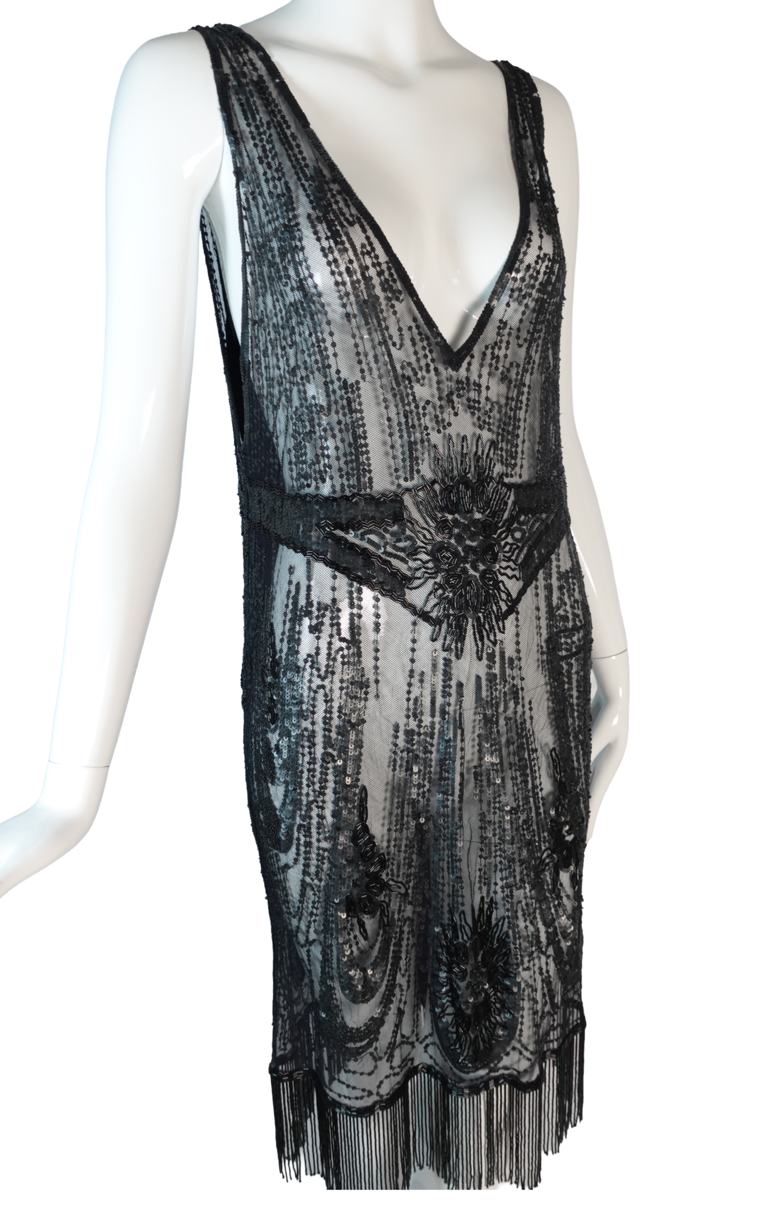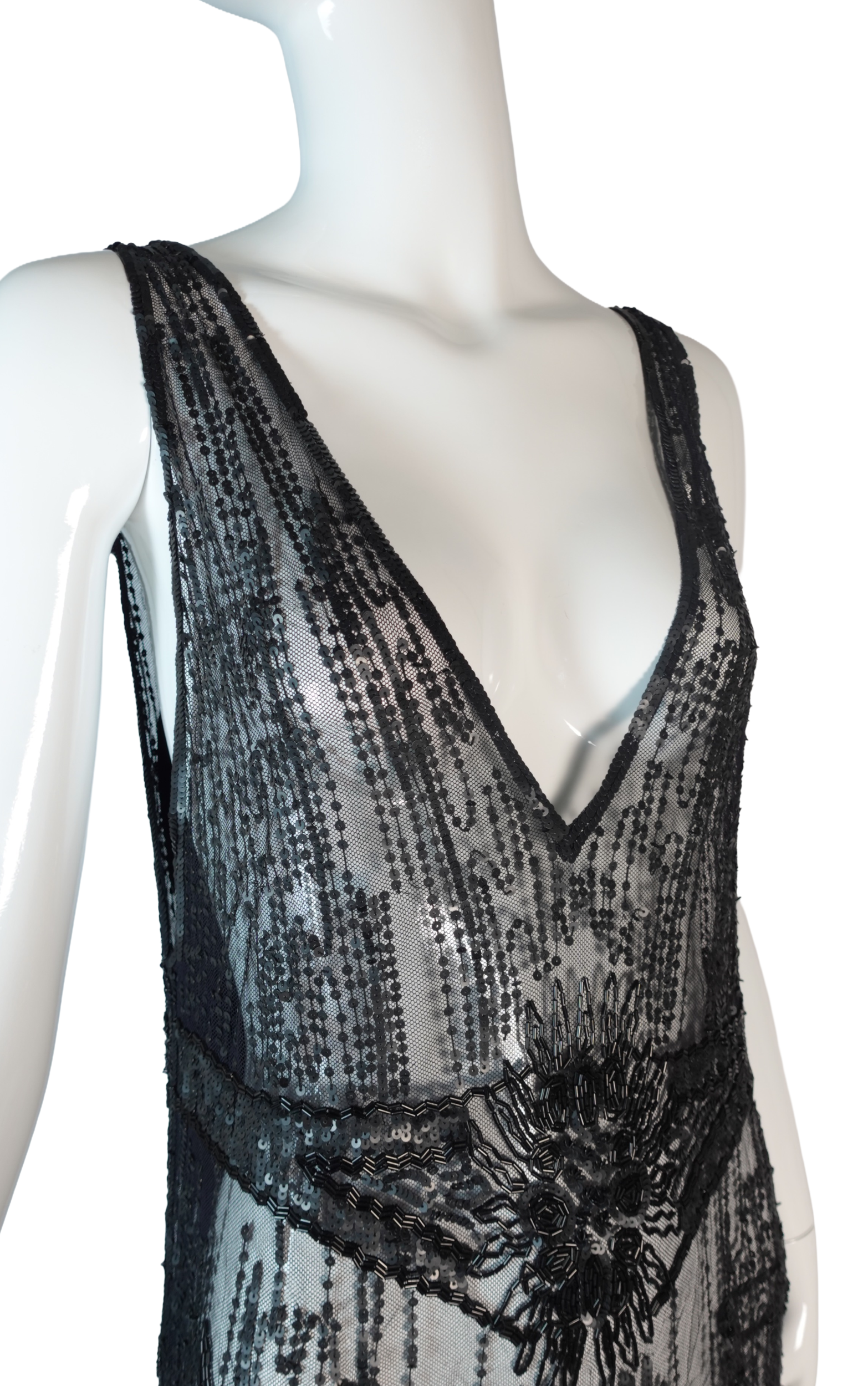 A stunning piece from Ralph Lauren’s Fall 2010 Ready-to-Wear collection, this midi-length dress is a masterclass in Art Deco-inspired glamour. Crafted from sheer black tulle, it features an all-over hand-beaded and sequined design with intricate floral and scrollwork motifs that catch the light beautifully. The dress finishes with a dramatic fringe hem, nodding to 1920s flapper-era elegance. A deep V-neckline and sleeveless silhouette give it a modern sensuality, while the structured beadwork creates a figure-hugging shape.