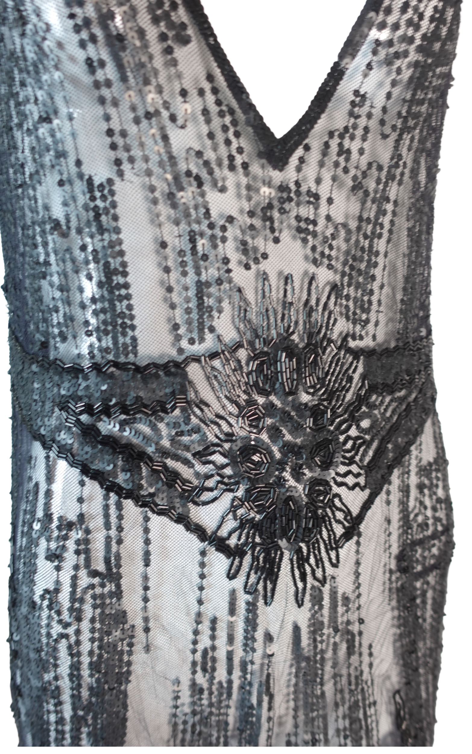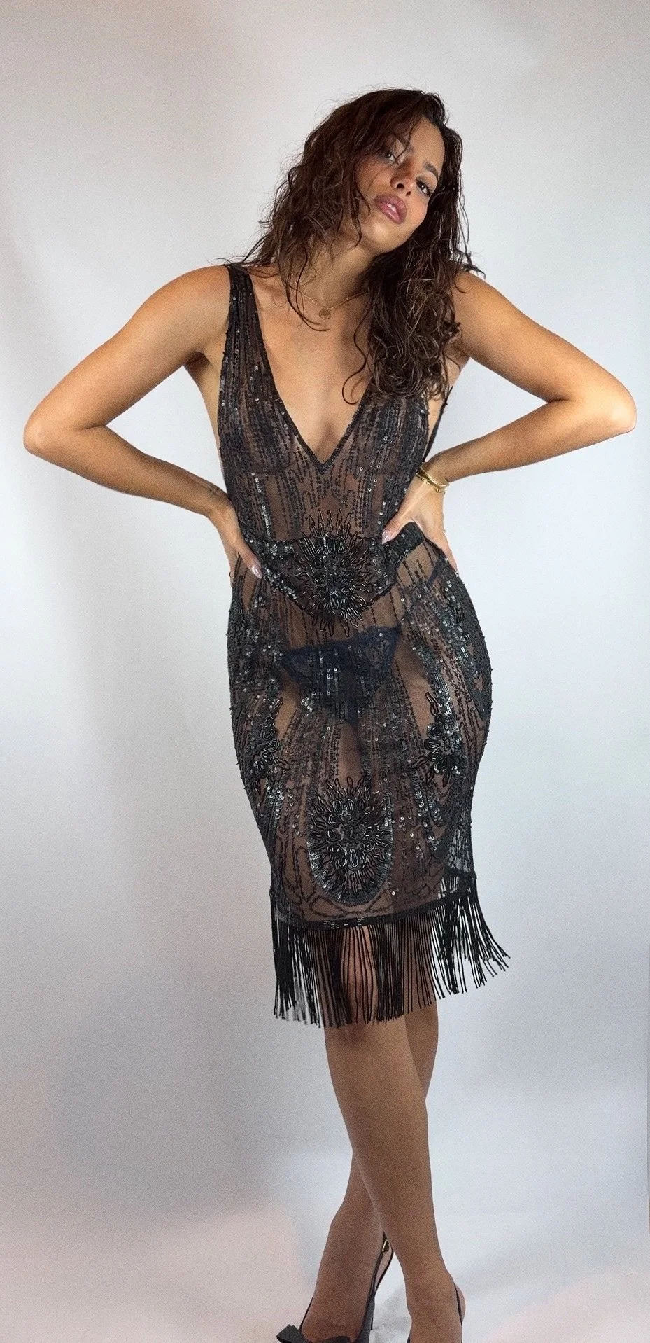 The dress comes with a black inner slip lining, making it fully versatile — wear it with the slip for a polished, sophisticated look, or remove it for a daring sheer effect that lets the intricate beadwork take center stage against the skin. The dress is equally breathtaking from every angle, with the beading creating a rich, dimensional texture that catches the light beautifully front and back.