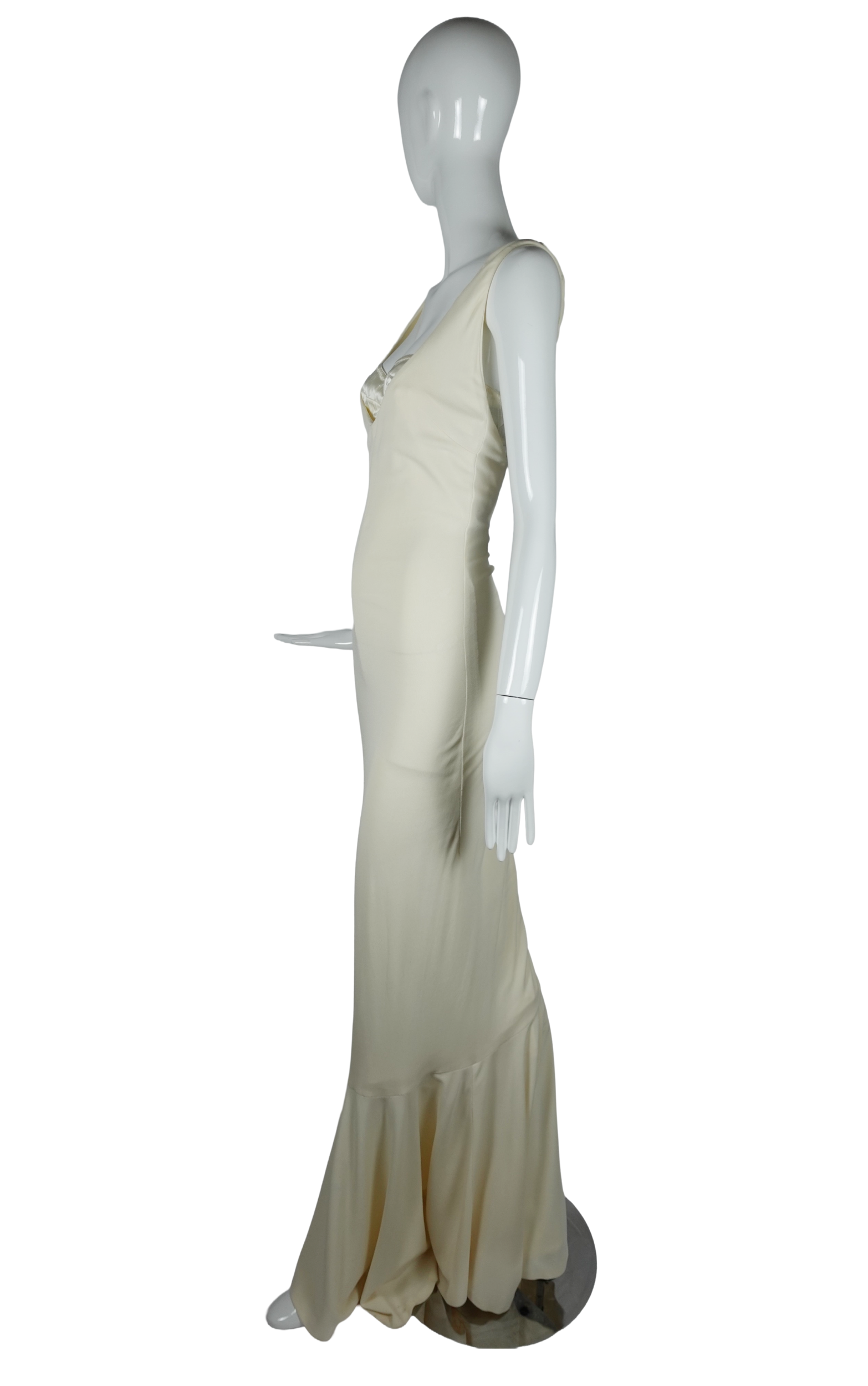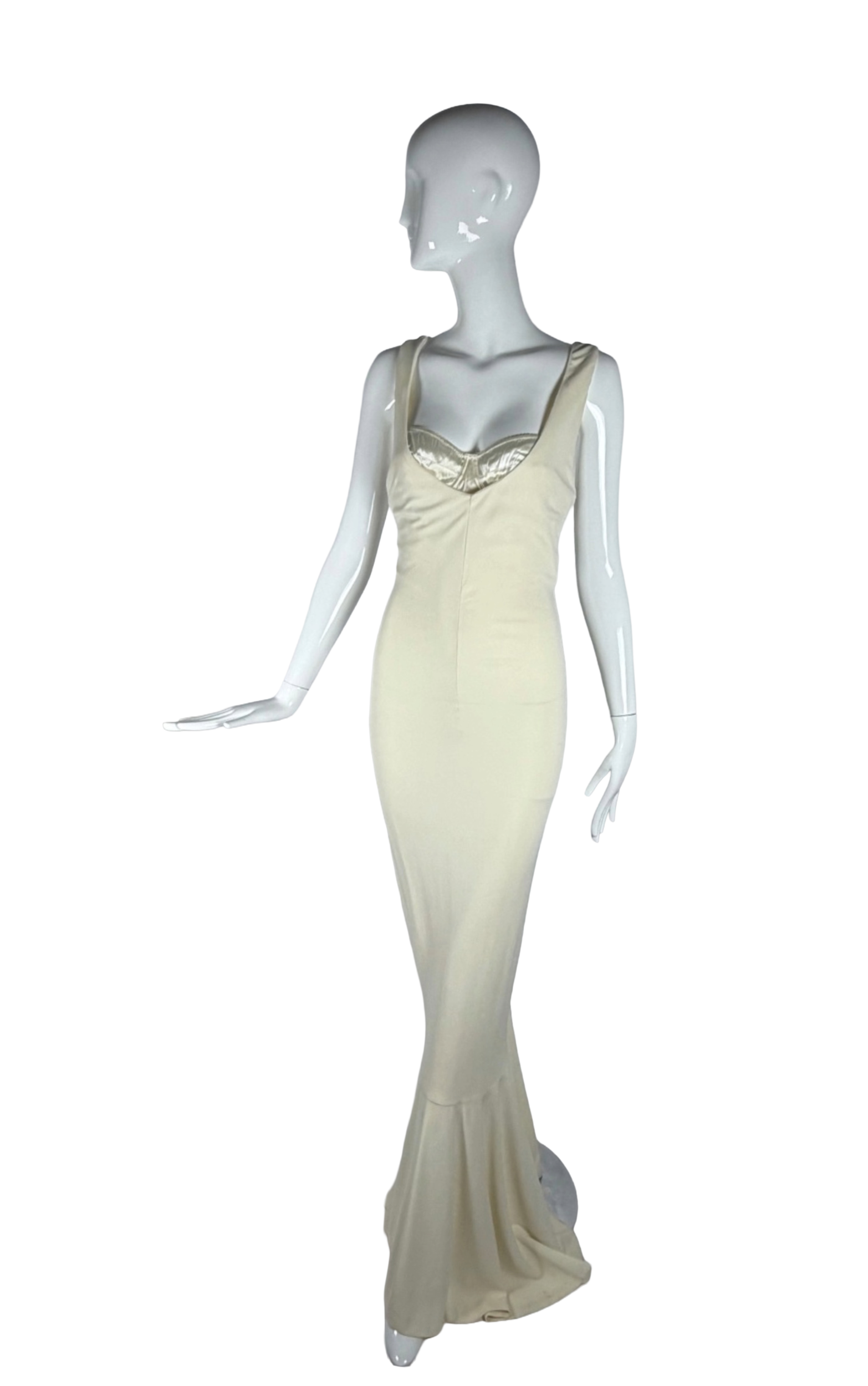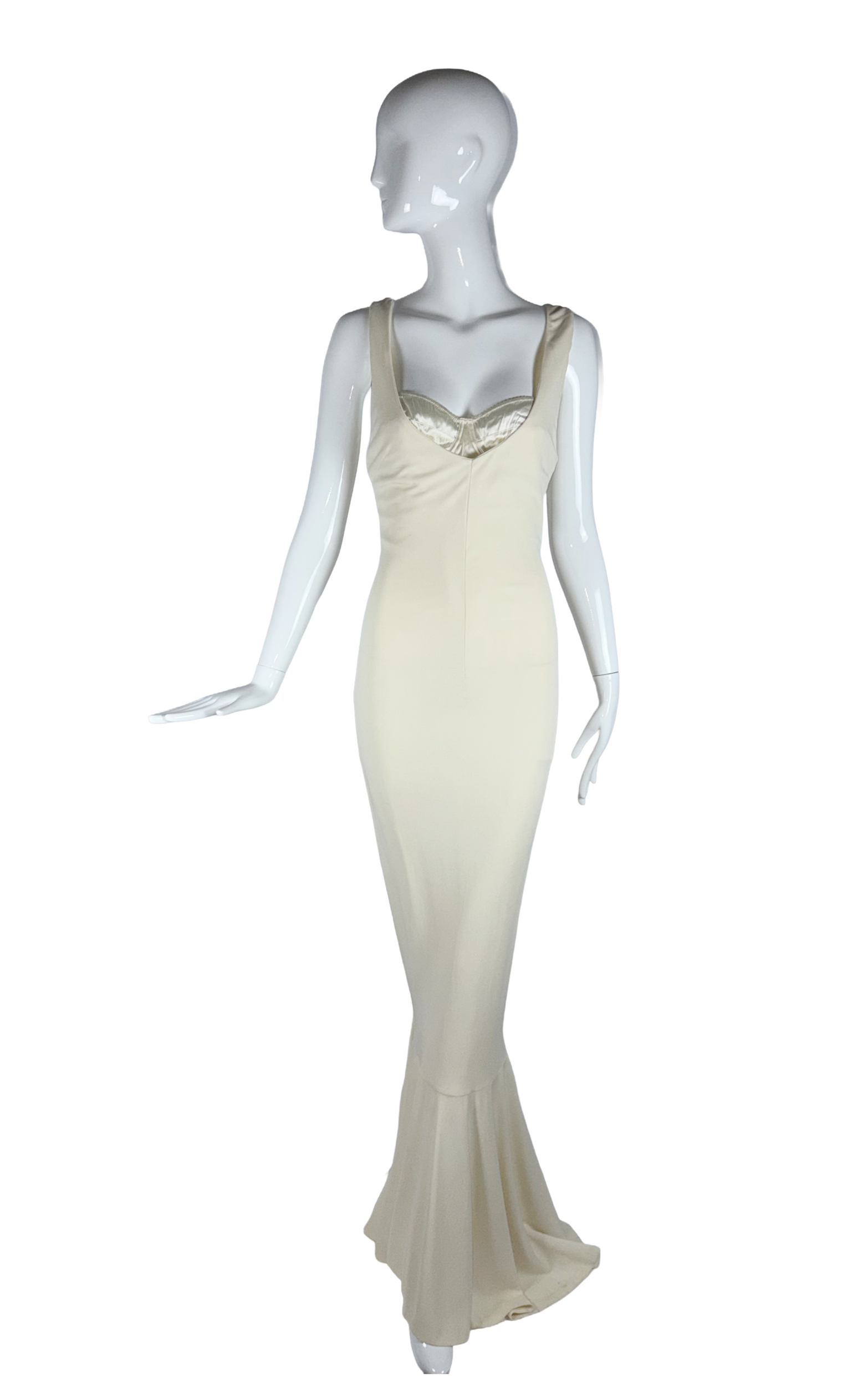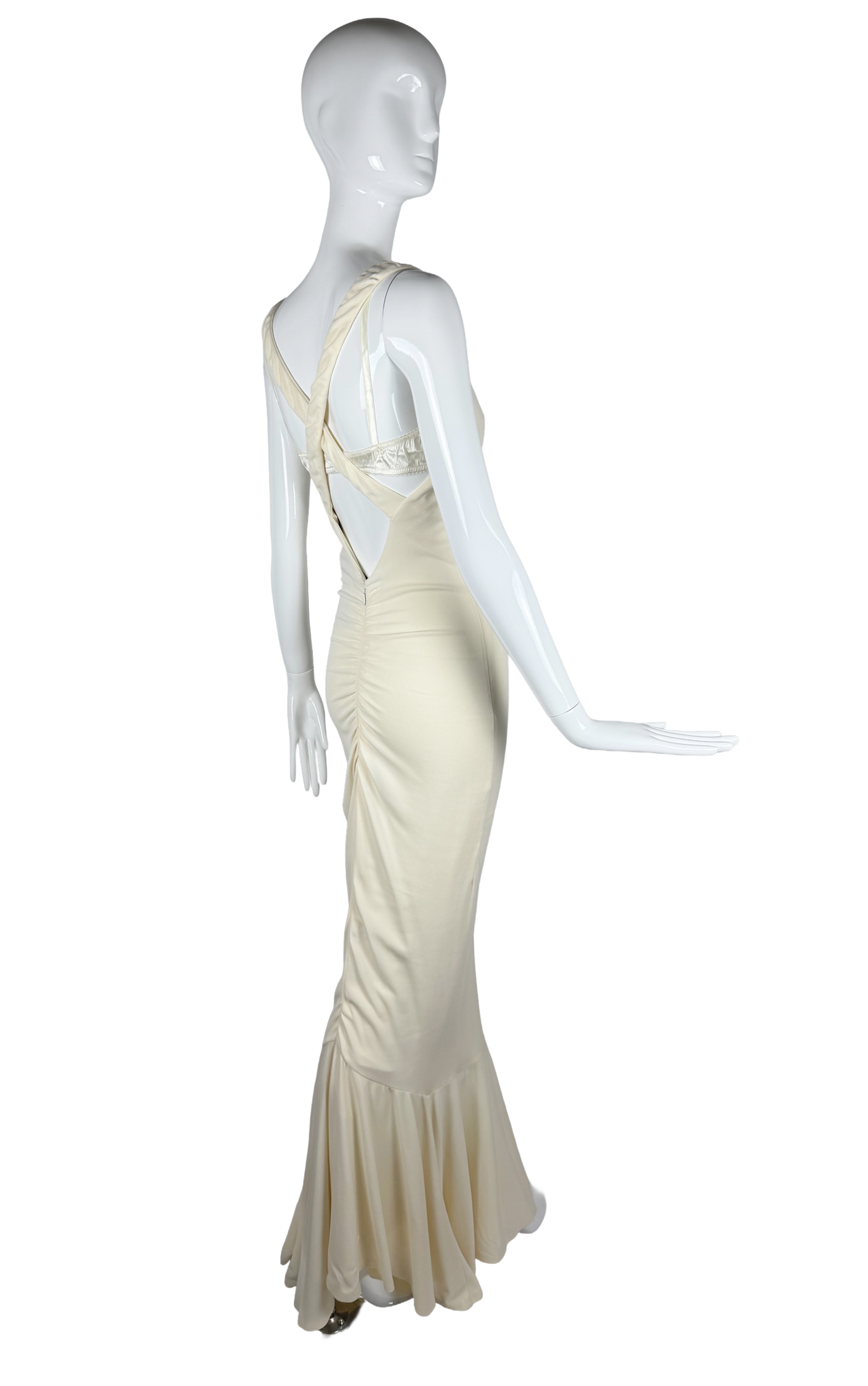 A stunning example of Dolce & Gabbana’s early 2000s mastery of the female form, this ivory jersey mermaid gown from the Spring/Summer 2001 collection embodies the house’s signature blend of sensuality and structural elegance.