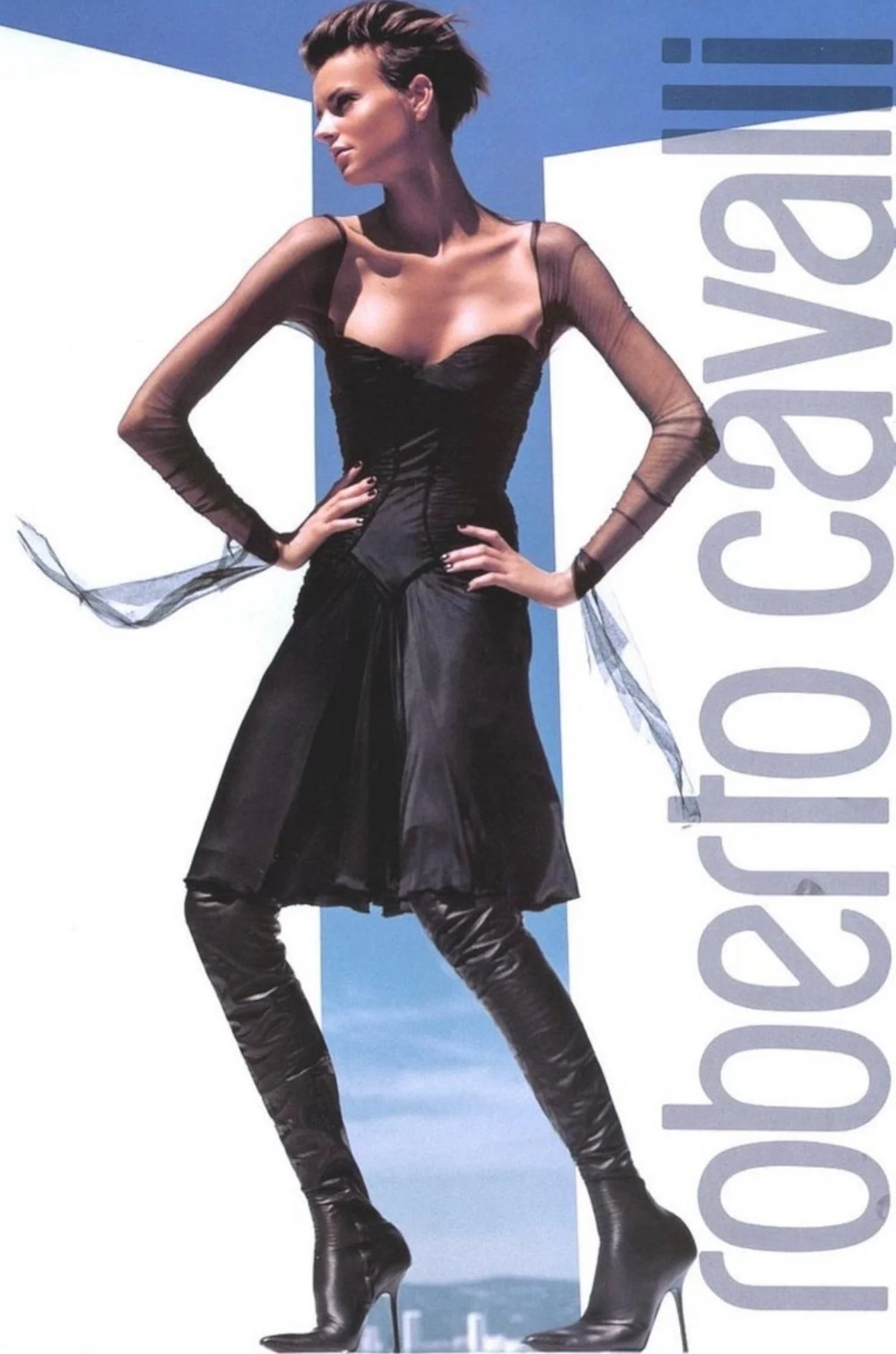 F/W 2003 Roberto Cavalli Runway Ad Black Ruched Flare Mesh Sleeve Dress